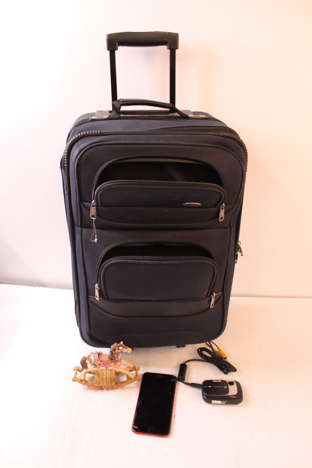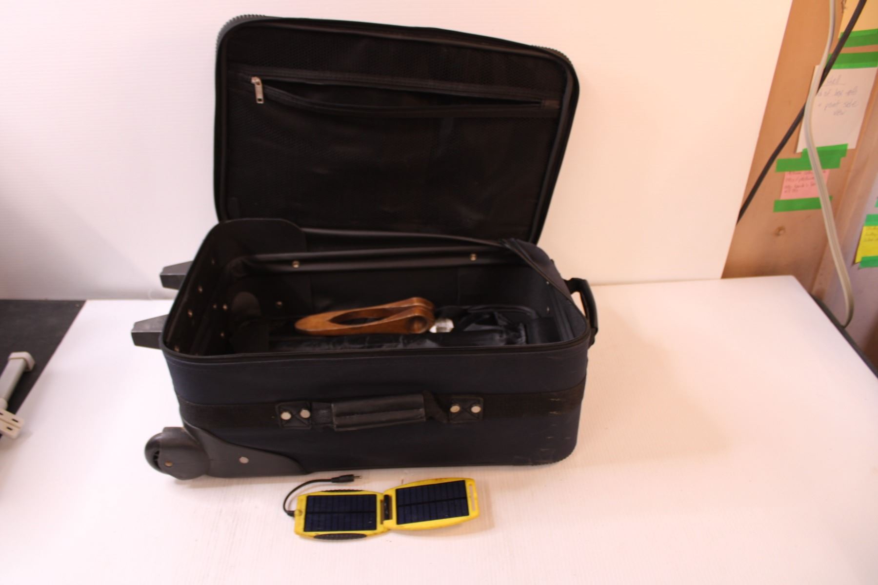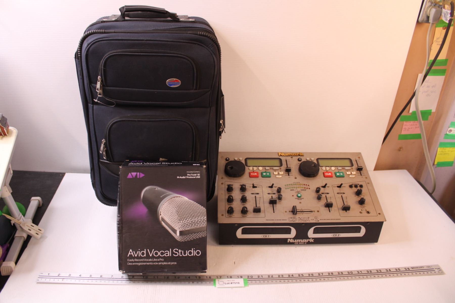 Suitcase, Camera, Cell Phone, Microphone, Numark CD Mix Station