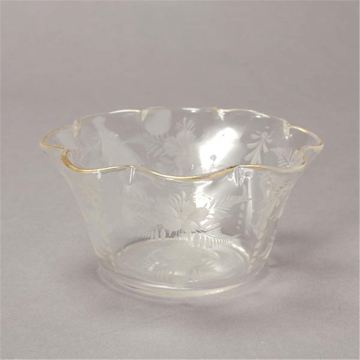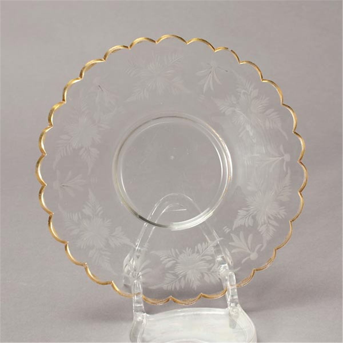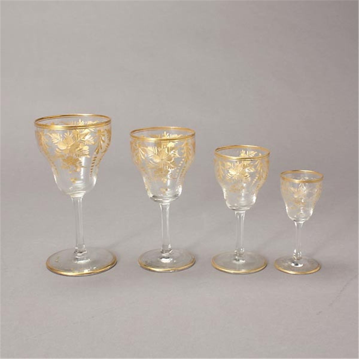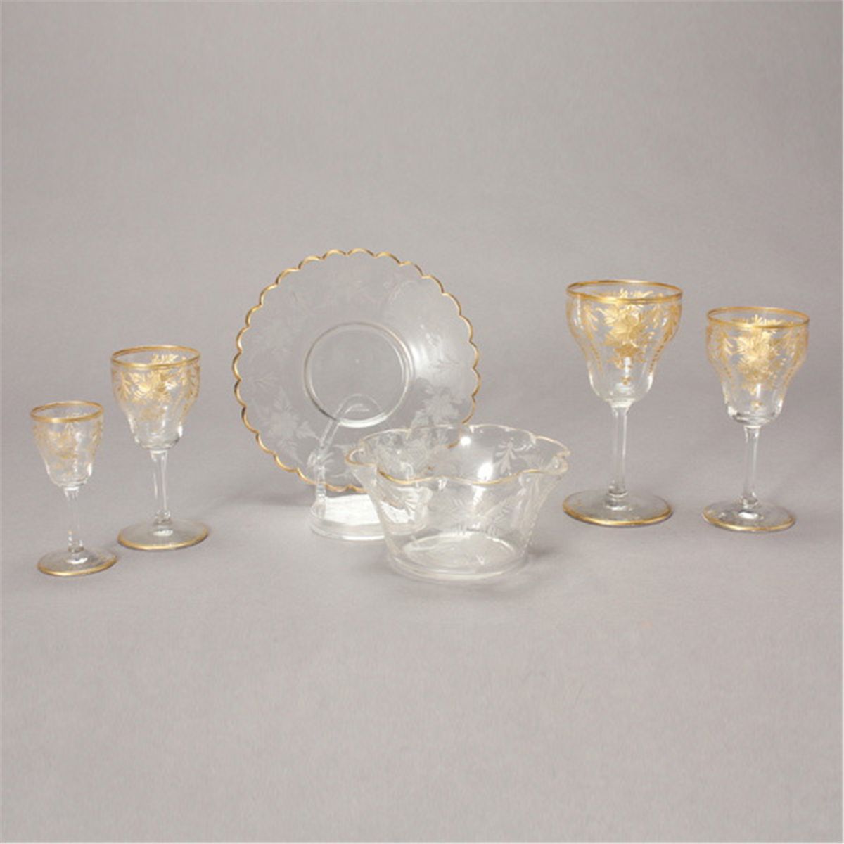 Suite of Bohemian Gilt Etched Stemware: six wine glasses (height 5 1/2 inches); ten cordials (height 5 inches); seven aperitifs (height 4 1/4 inches); four liquor (height 3 1/2 inches); five bowls and twelve undertrays (44)
