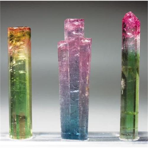<B>SUITE OF THREE TOURMALINE CRYSTALS</B></I><BR><BR> <I>Minas Gerais, Brazil</B></I><BR>These three gem tourmalines are the product of two of the more renowned sources for exotically colored tourmaline in the world: the Cruzeiro mine and the Santa Rosa mine, both located in the state of Minas Gerais, Brazil. The green prism with the red pyramidal termination is from the Cruzeiro Mine. Its color grades from a grass green base upwards into a short colorless zone and finally ends in a cranberry magenta tip. The second Cruzeiro piece is also green for most of its length, it is somewhat different in that it possesses a pastel pink core near the base and instead of a red pyramidal termination it exhibits the flat form. Both are clean and sharp with a glassy luster. The third crystal which comes from the Santa Rosa Mine displays several differences from the first two. Its color at the base is a cool pastel blue. This blue is both enveloped with and terminated by a red outer layer. This gives the piece the appearance of a lilac body color over a portion of its length. In addition, the piece displays multiple flat terminations with complex modification to the edges. The luster is an unusual satin etched type occasionally seen in specimens from this mine. It is clean and free from damage. All of the crystals are approximately 2 ½ inches in height and are mounted on a custom base for display purposes. Ex Steve & Clara Smale collection.<BR><BR><b>Shipping:</b> Requires 3rd Party Shipping (<a target="_blank" href="http://www.heritageauctions.com/common/shipping.php">view shipping information</a>)