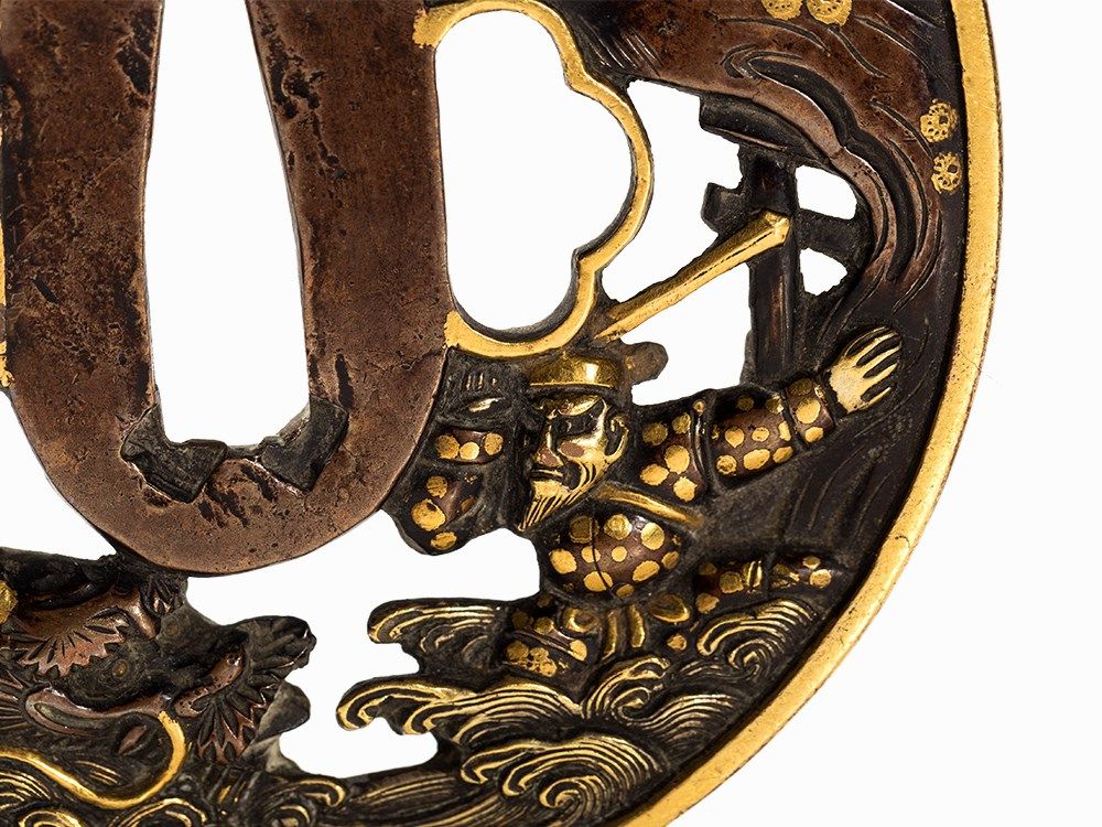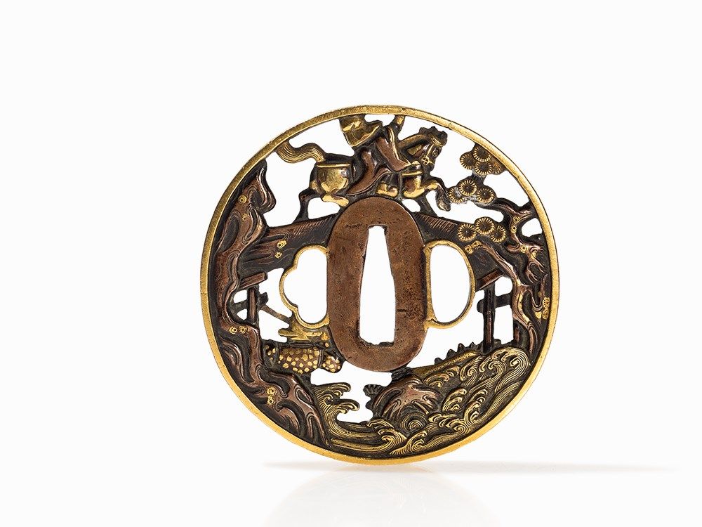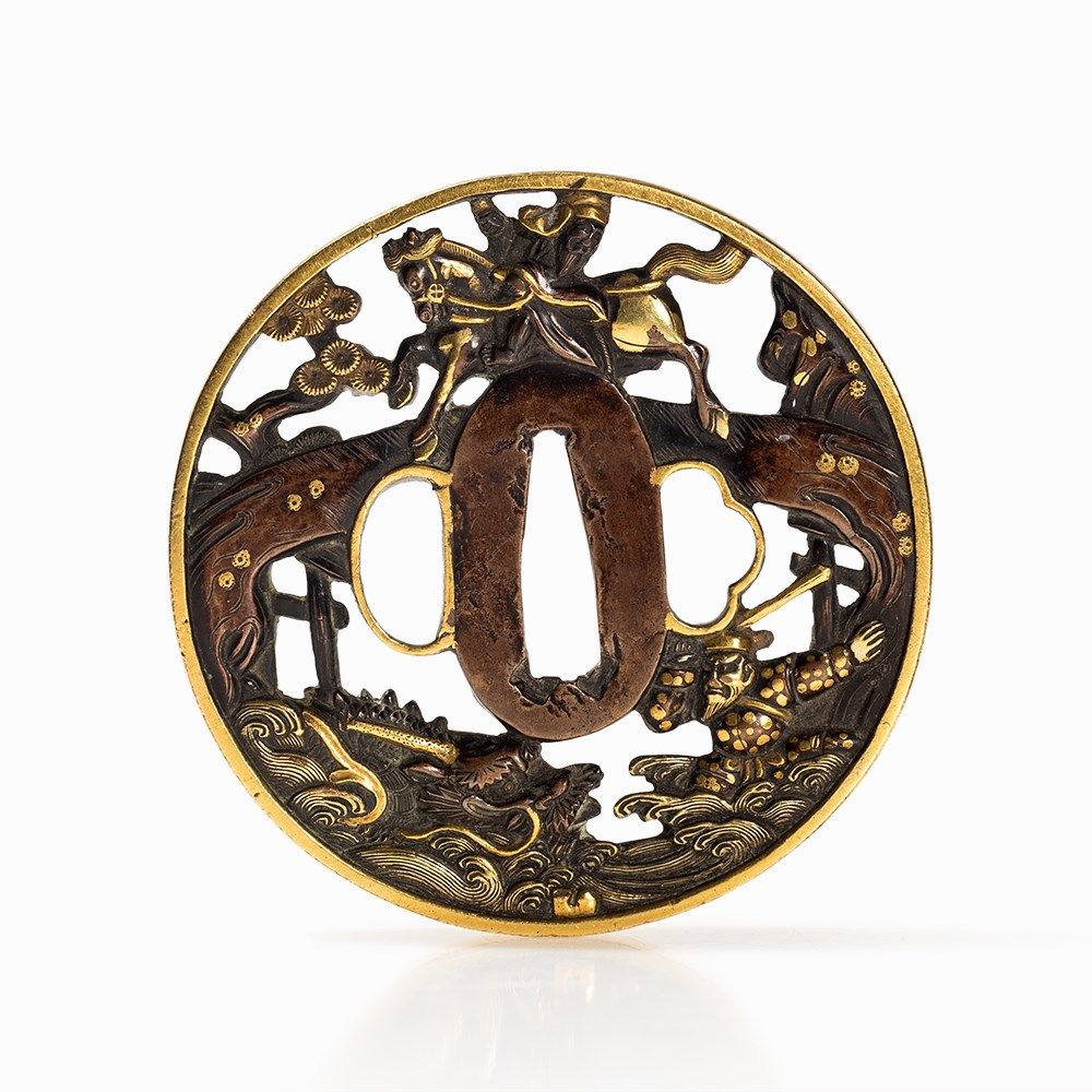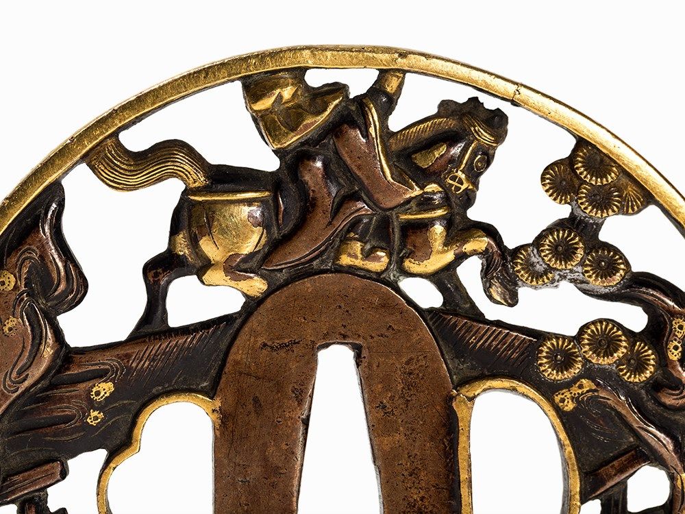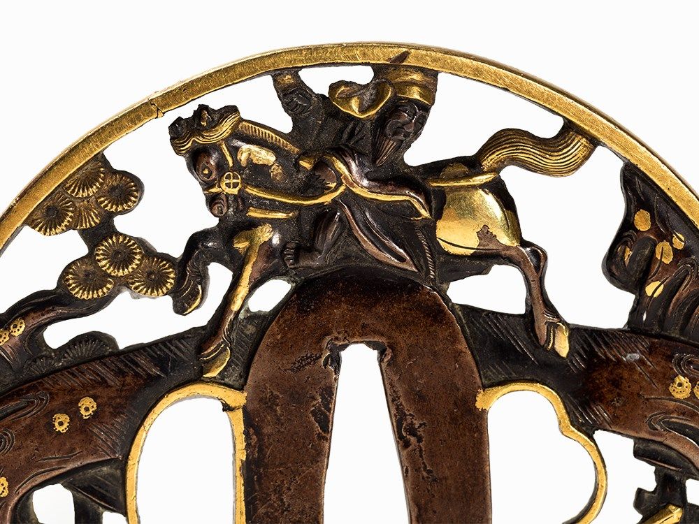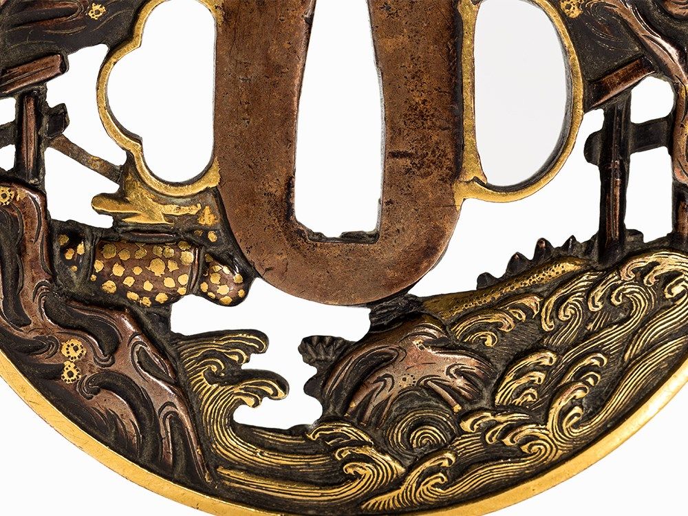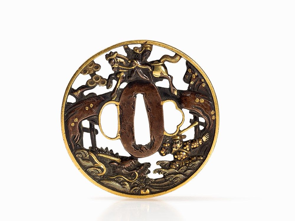 This ornamental open work tsuba was made in the Japanese Edo period (1603-1867) and consists of inlays in shibuichi, shakudo and shows gold and silver overlays as well as silver plating and gilding. The tsuba shows an accurate design in sukashibori with iroezogan. So a warrior on a bridge and one confronting a fast running stream are rendered. A dragon's head rises out of the waves of the water and gnarled pines are rendered at the edges. The outer edge is covered with gold and two recesses for a kozuka and a kogai are visible adjacent to the central slit.