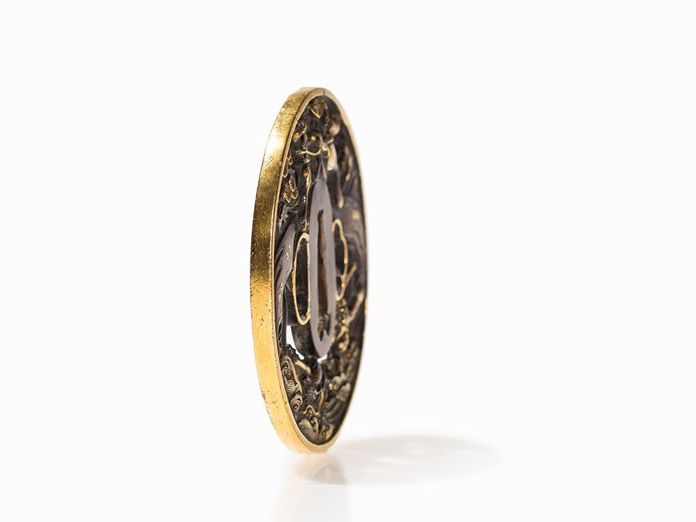 The tsuba is in good condition with only slight age-related signs of wear, such as small scratches, nicks and minimal abrasion. The dimensions of the tsuba are approx. 8 x 8 cm