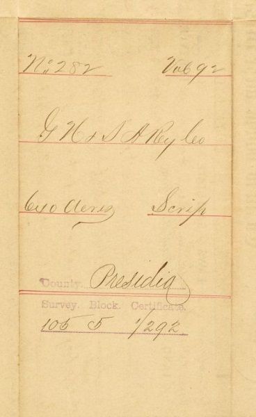 650 Acre Land grant to the Galveston, Harrisburg, and San Antonio Rail Road in Presidio County. Measures 17" wide x 14" tall.