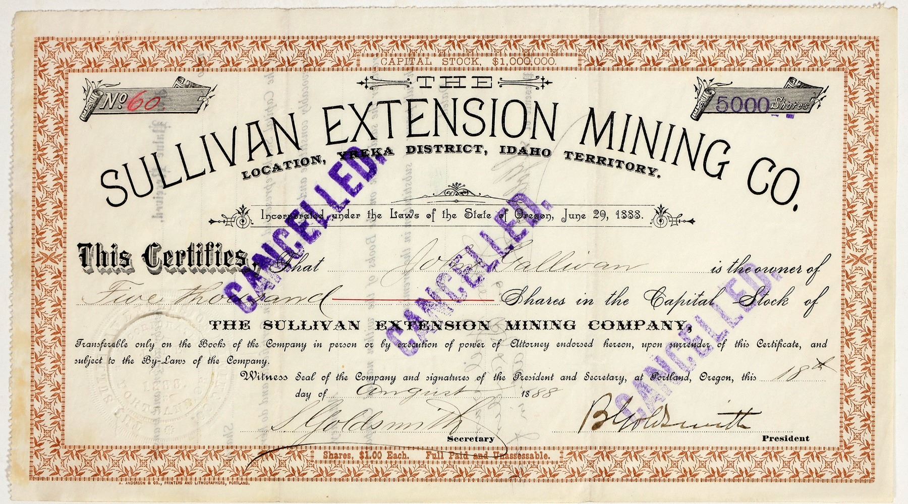 "Location, Yreka District, Idaho Territory" (printed under title). Inc. in Oregon, 1888. No. 60, issued for 5000 shares to John Gallivan in Portland in 1888. Signed by president and secretary Goldsmith. Stamp cancelled. Brown border and black print. 5.75 x 10.5" The Yreka Mining District is located in Shoshone County, Idaho. The best known company in the district for many years was the Bunker Hill and Sullivan Mining and Concentrating Co., organized in 1887. This company might have been absorbed at some point into the Bunker Hill company. Information on the Sullivan Extension Mining Company is elusive.