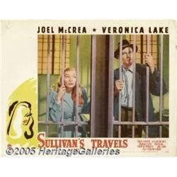 <B>Sullivan's Travels (Paramount, 1941)</B></I> Lobby Card (11" X 14"). Preston Sturges' classic film featured Joel McCrea as a director disappointed with the film's he's made and looking for the inspiration to make an "important" picture. He decides to go "undercover" as a hobo to learn about the downtrodden. Along the way, he finds Veronica Lake and she gets him into more trouble than he counted on. This scene in the jail is one of the film's more comedic moments. The card has a pinhole in each of the upper corners and one in the center of the lower border. There is a smudge mark in the film's title. Fine/Very Fine condition.