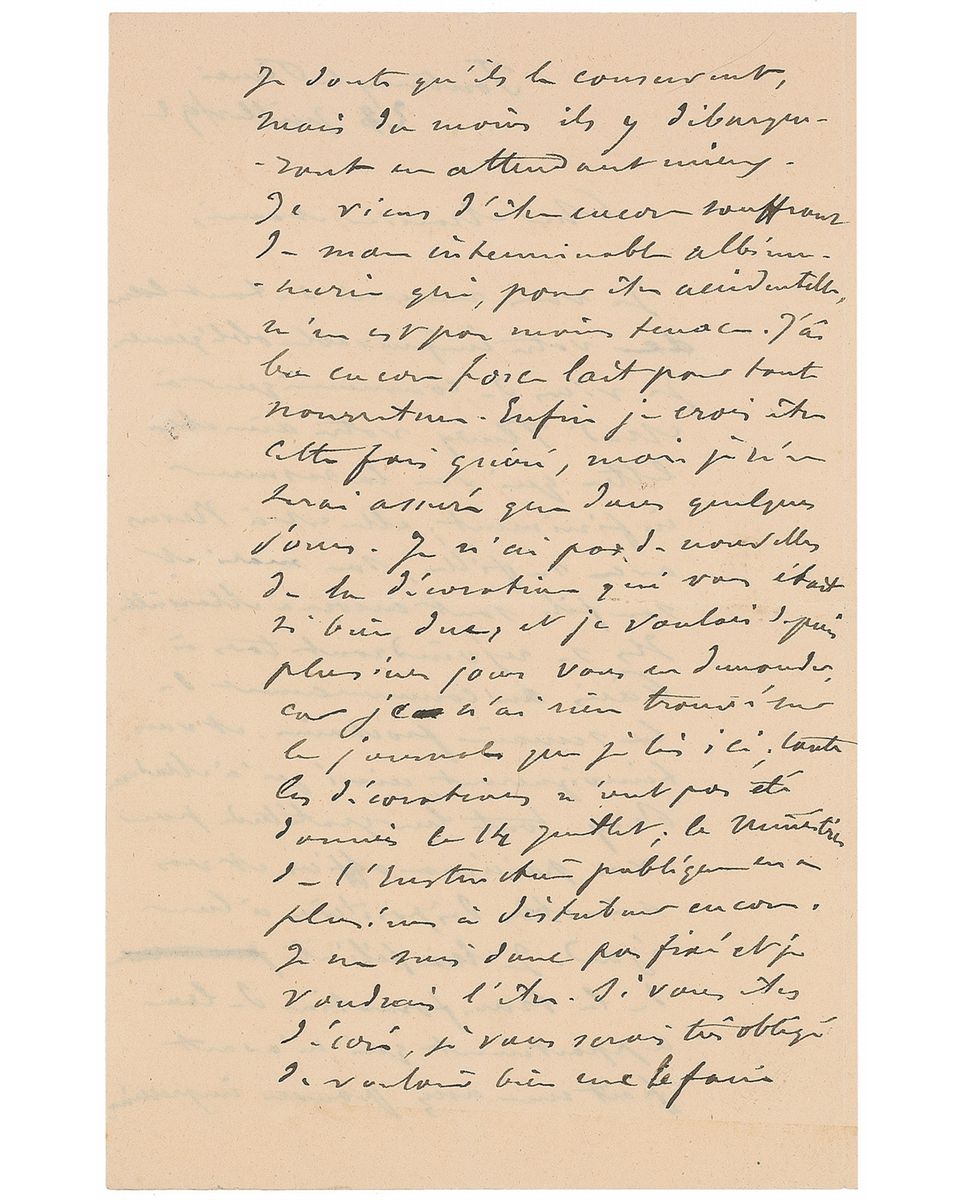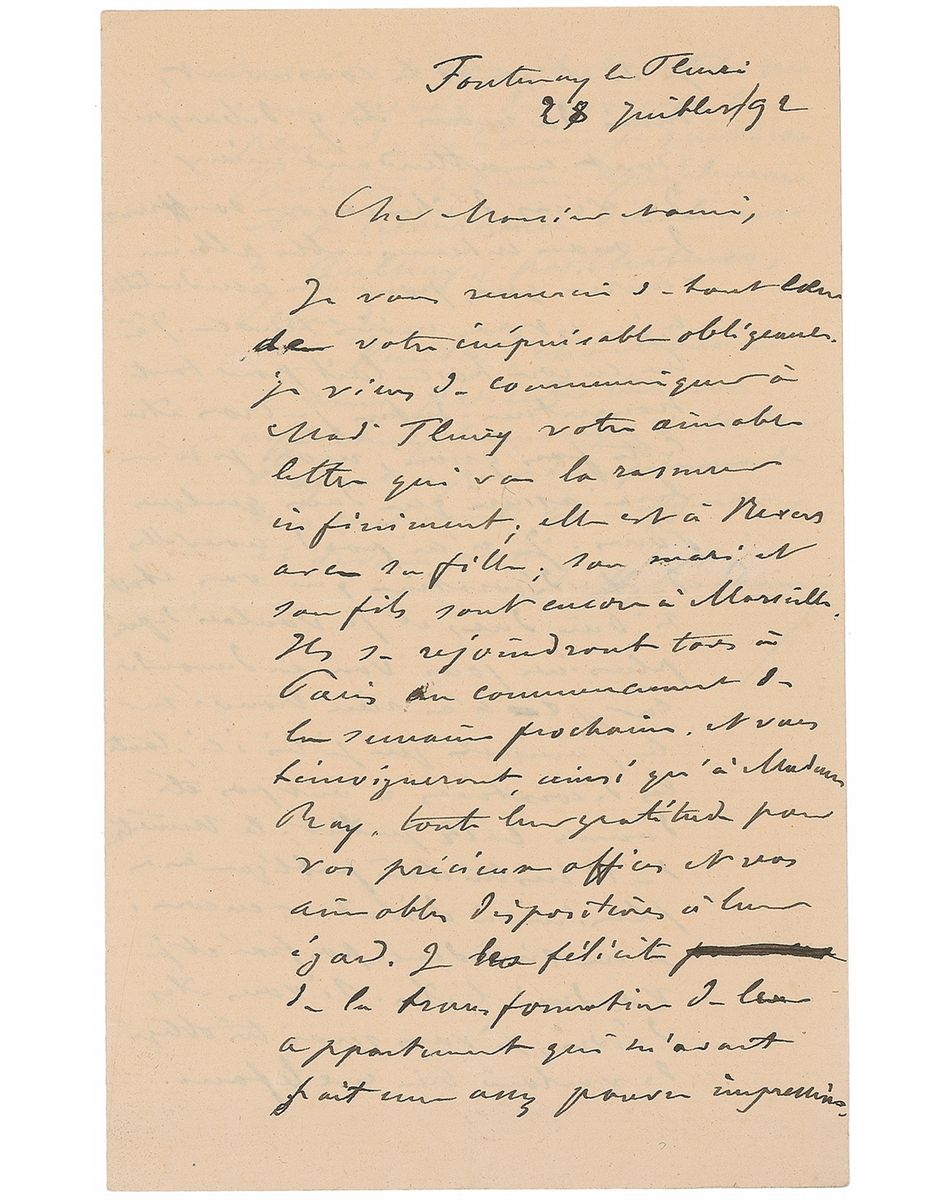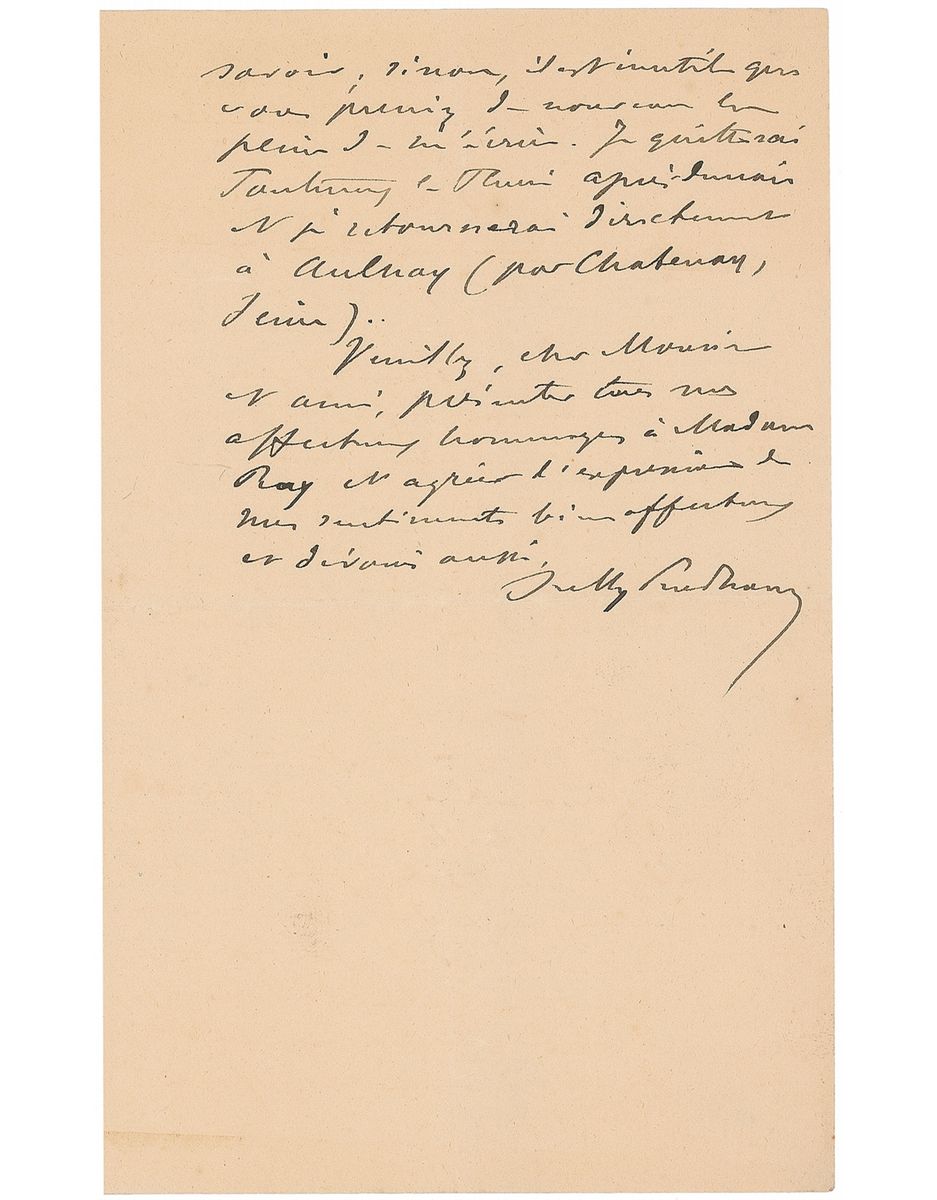 French writer (1839–1907) who won the 1901 Nobel Prize in Literature. Untranslated ALS in French, three pages, 4.25 x 7, July 28, 1892. In fine condition, with central vertical and horizontal folds. Accompanied by an unrelated letter in another hand mentioning Prudhomme.