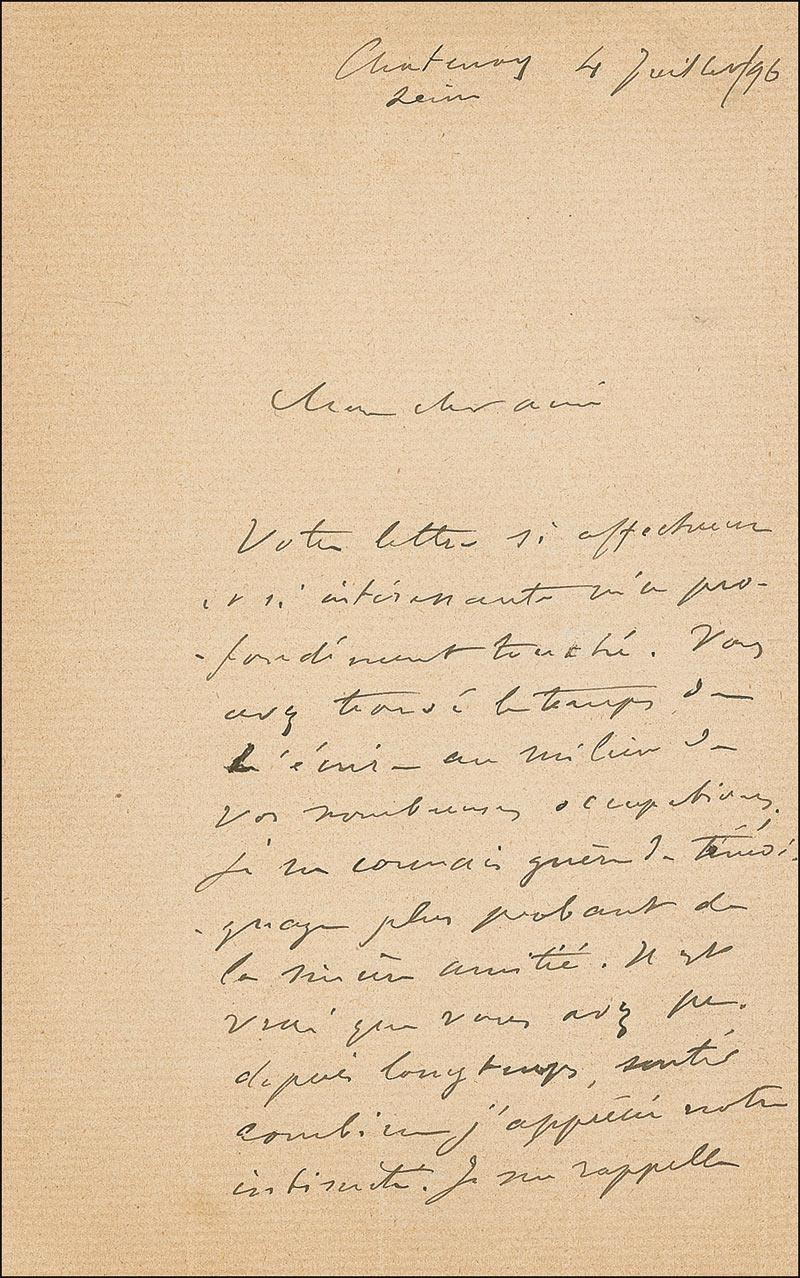 French writer (1839–1907) who won the 1901 Nobel Prize in Literature. ALS in French, three pages on two adjoining sheets, 4.5 x 7, July 4, 1896. Untranslated letter to a friend who is to be married. In fine condition, with uniform light toning. RRAuction COA.