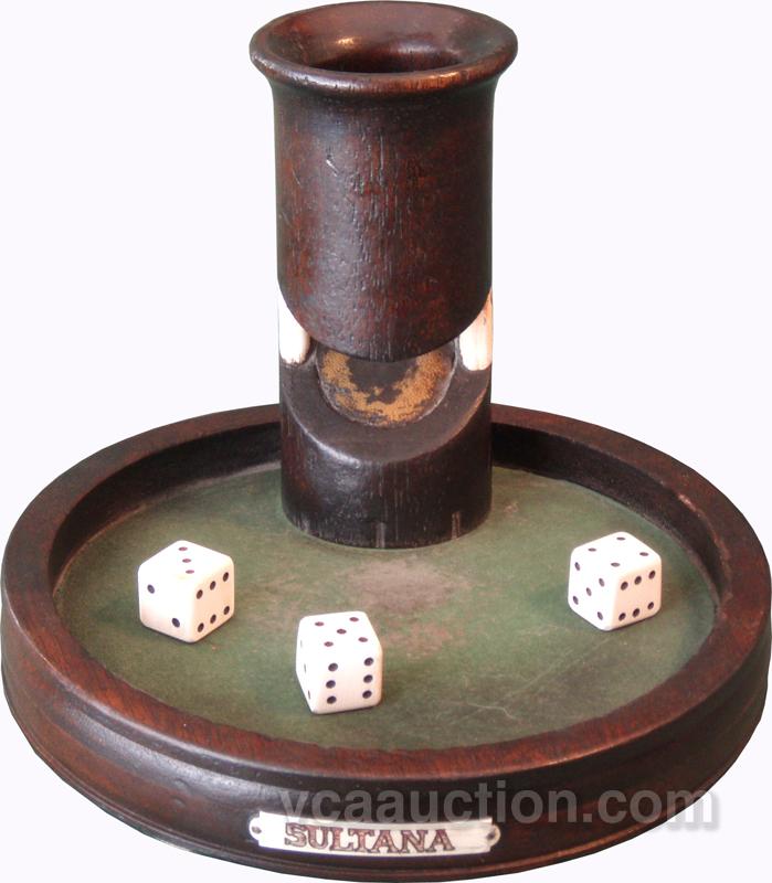 Sultana Dice Drop - Believed to have come off the famous Steamboat Sultana, that ended her run in tradedy when an explosion killed approx. 1700 people - the worst maritime disaster in American history! Measures 6" H x 7" D with scrimshawed ivory trim, ivory name plaque, and three ivory dice. Light warpage/ seperation near the back of the bowl; felt and leather show wear, otherwise in good condition; c1860s, includes 30-page research study addressing provenanace, authentication, history of the vessel, history of dice drops, and much more (read the reasearch at files.me.com/dlowdis/1dzw66 )