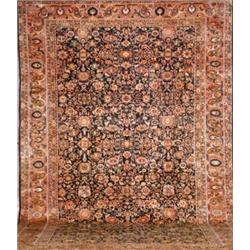 Blue ground with rosette and trellising vine field within a rosette and trellising vine guard border on red ground.