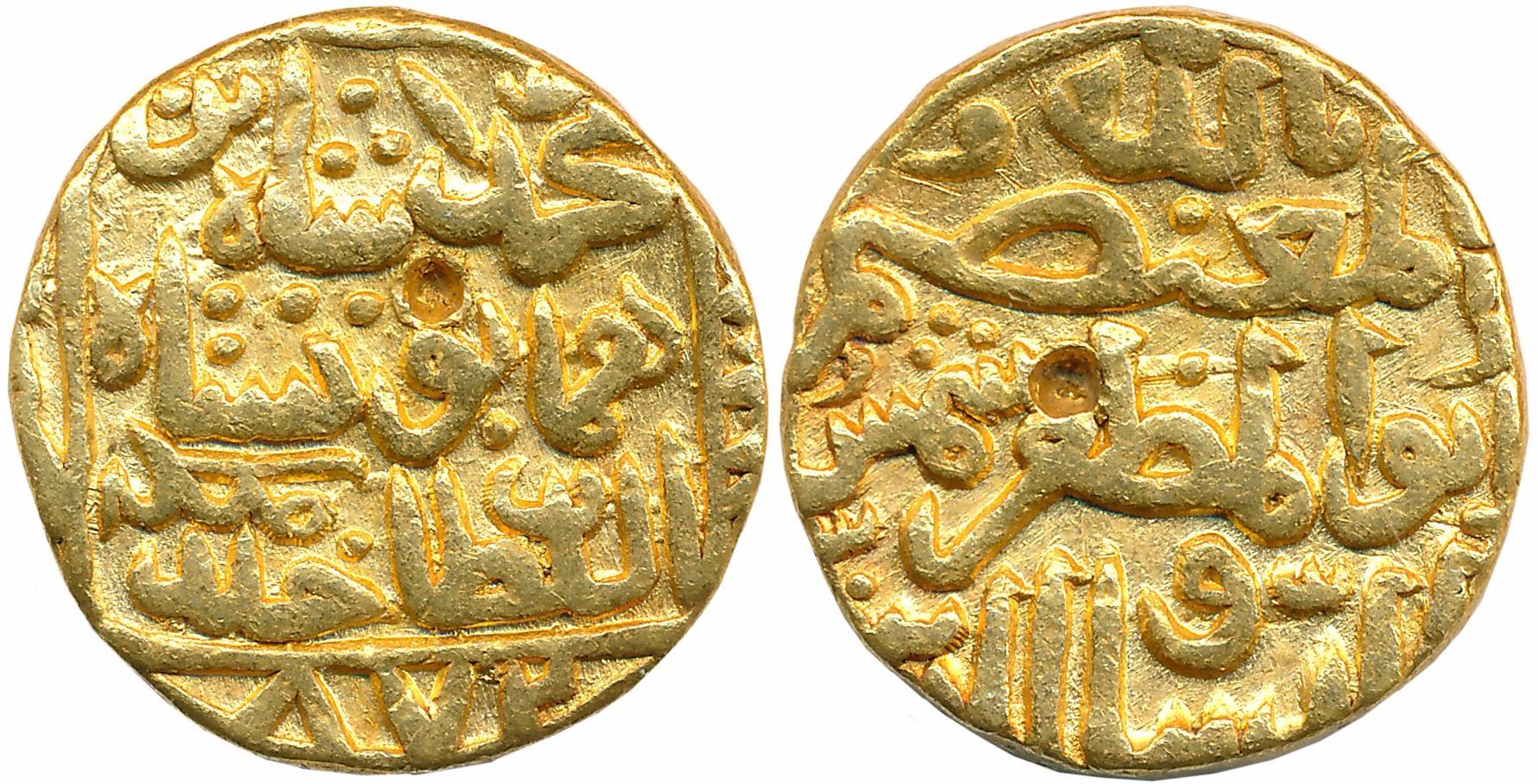 Shams al din Muhammad Shah III, Gold Tanka, 11.06g, Hadrat Muhammadabad Mint, AH 872, Obv: muhammad shah bin humayun shah al sultan khallada mulkahu, Rev: al mu tasim billah abu’l Muzaffar shams al dunya wa’l din (G&G# BH110). Very fine+, very rare.