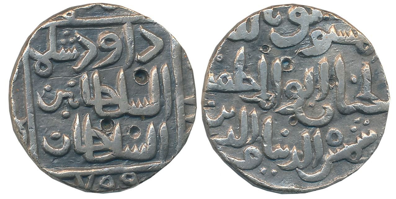 Shams al din Daud Shah II, Silver Tanka, 10.60g, Hadrat Ahsanabad Mint (Partially visible), AH 799, Arabic legend on both sides, Obv: “da’ud shah al sultan bin al sultan”, Rev: “al mustawthiq billah al hanman abu’l muzaffar shams al dunya wa’l din” (G&G# BH57). Very fine+, extremely rare.