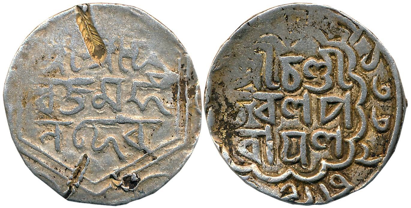 Dhanujmardan Dev, Silver Tanka, 10.57g, Chatigrama (Chittagong) Mint, SE 1339, Bengali legend on both sides, Obv: "Sri Sri Da/nujamardda/na Deva", Rev: "Sri chandi/charana pa/rayana" (G&G# B315). Usual chop marks on obverse, very fine+, exceedingly rare.