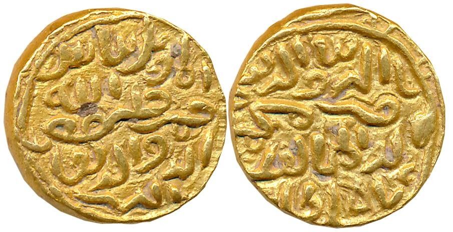 Nasir al Din Mahmud, Gold Tanka, 10.91g, Mintless type, “abu’l Mujahid” legend (G&G# B405). Extremely fine, rare.