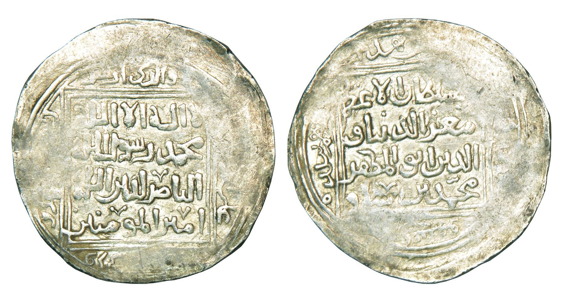 Sultans of Delhi, Ghurid Sultans of Ghazna and Delhi, main line, silver double dirham of Muizz ad-Din Muhammad bin Sam (1171-1206 AD) as sole ruler, Baldah Ghazna mint, not listed in G&G, Album 1772, 10.01g. Obv: In double square, arabic legend al -Sultan al-'Azam Mu'izz al-Dunya wa al-Din Abu al-Muzaffar Muhammd bin Sam, mint and date (not visible) in margins. Rev: In double square, shahada followed by legend al-Nasir li-Din Allah Amir al-Mumineen.