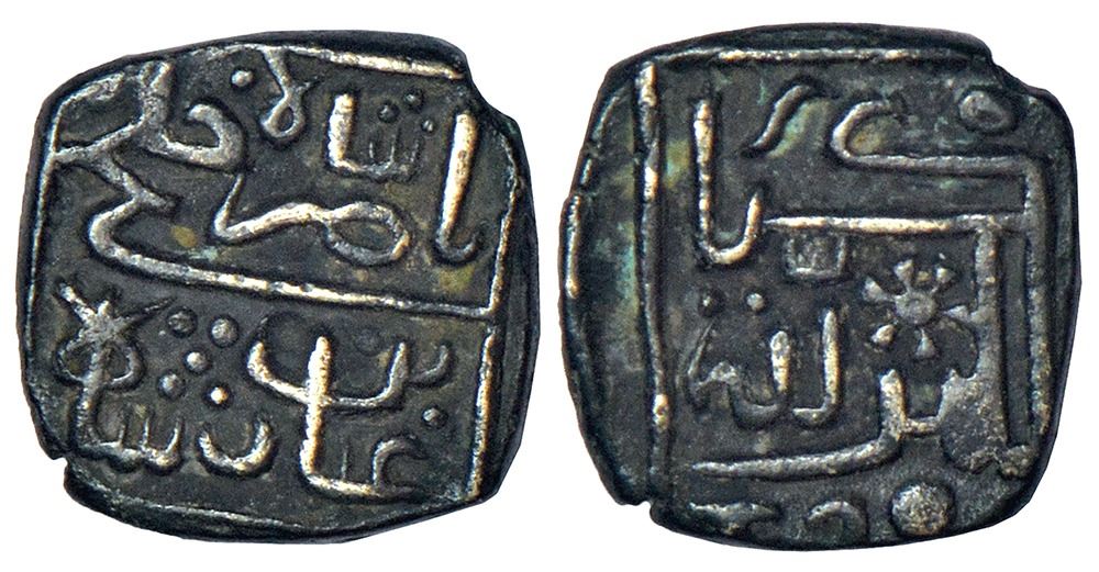 Sultans of Malwa, Silver square 1/8 tanka of Nasir Shah (1500-1510 AD), date partly visible, G&G M113, 1.24g. Obv: Nasir Shah Khalji Bin Ghiyath Shah. Rev: Al-Kibriya lillah.