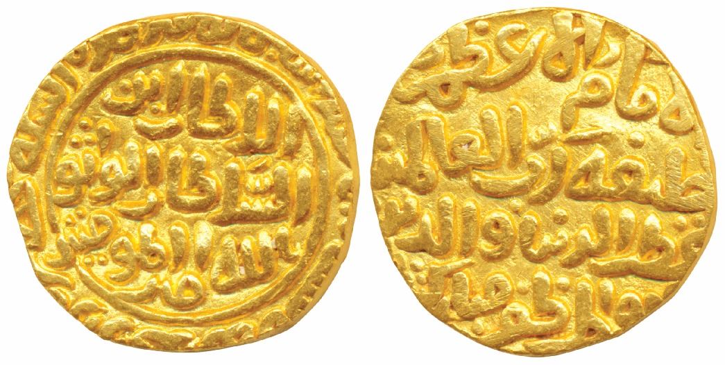 Qutb al-din Mubarak (AH 716-720, 1316-1320 AD), Gold Tanka, 10.96g, Hadrat dar al-Khilafat Mint, AH 717, legend: Al imam al azam khalifa rabb al alamin Qutb al duniya was al din abul muzaffar Mubarakshah al sultan ibn al sultan al wathiq billa amir al momenin; date and mint name in margins (G&G D245). Nice broad flan, About Extremely Fine, Very Rare. Although Goron & Goenka classify this coin as a single R that is slightly Rare, it is indeed very hard to find a mint other than Qila Qutbabad in this series.