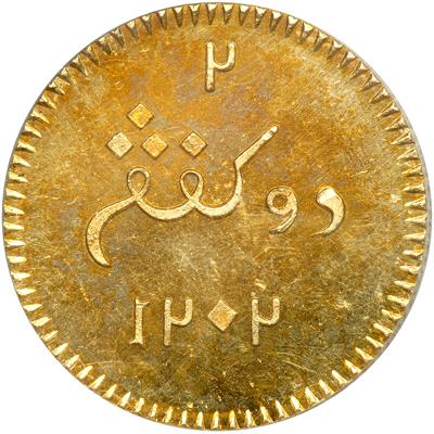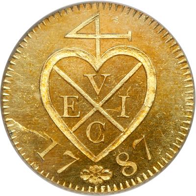 Sumatra. 2 Kepings, 1787. Pridmore-13B; KM-258. Gilt Copper. VEIC bale-mark, date below. Reverse: Value and date below. PCGS graded Proof 65.