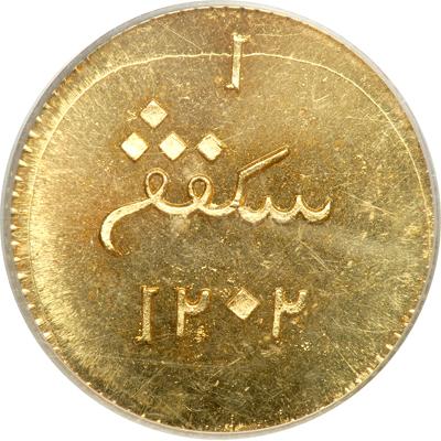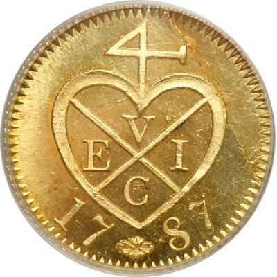 Sumatra. One Keping, 1787. Pridmor-19B; KM-257.1. Gilt Copper. VEIC bale-mark, date below. Reverse: Value and date below. PCGS graded Proof 65.