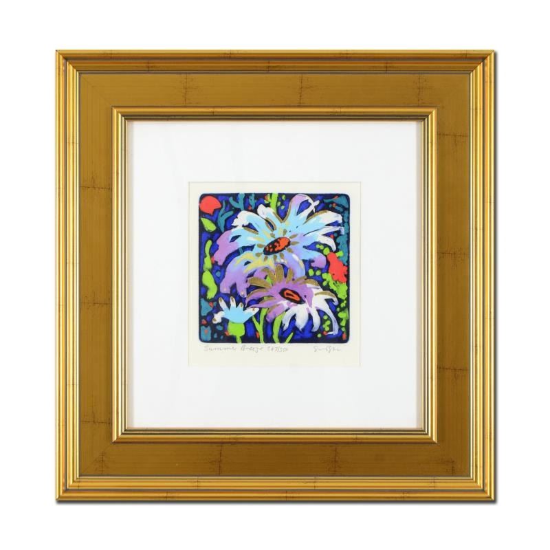 "Summer Breeze" is a hand colored limited edition etching on rag paper by Simon Bull, numbered and hand signed by the artist. Includes Letter of Authenticity. Measures approx. 19" x 19" (framed), 8" x 8" (image). There is minor wear on the corners and edges of the frame.