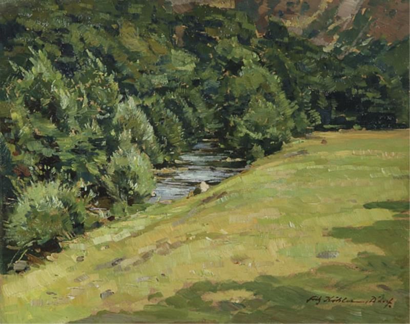 FRITZ KOHLER (German 1887-1972) Summer Landscape with Stream Oil on artist board, Signed lower right, 19.7 inches x 15.7 inches