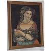A large framed print, 29 1/2'' X 231/2'', of a young lady carrying in her arms the fruits of summer and wearing a garland of grapes in her hair. The print is hand decorated with appliqués of tiny gold leaves on her dress and on the fruit. The necklace she is wearing as well as her earrings and braclets are also applied. Frame with old wavy glass, label on reverse reads: University Photo Shop, Fine picture framing, 810 University Ave. Madison Wis. Minor scars on frame.