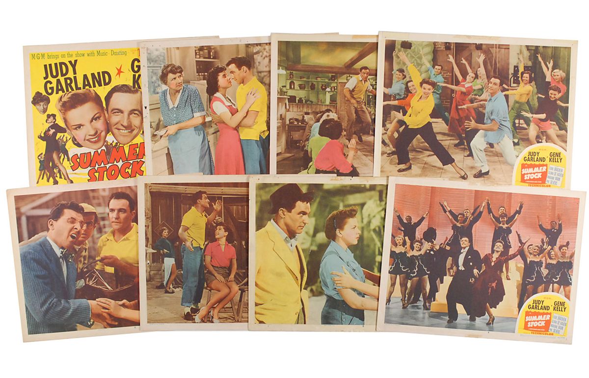 Complete set of eight original color 14 x 11 lobby cards for the 1950 film Summer Stock, starring Judy Garland and Gene Kelly—the last time they would work together. Various creases, soiling, and tape remnants to borders, otherwise overall fine condition.