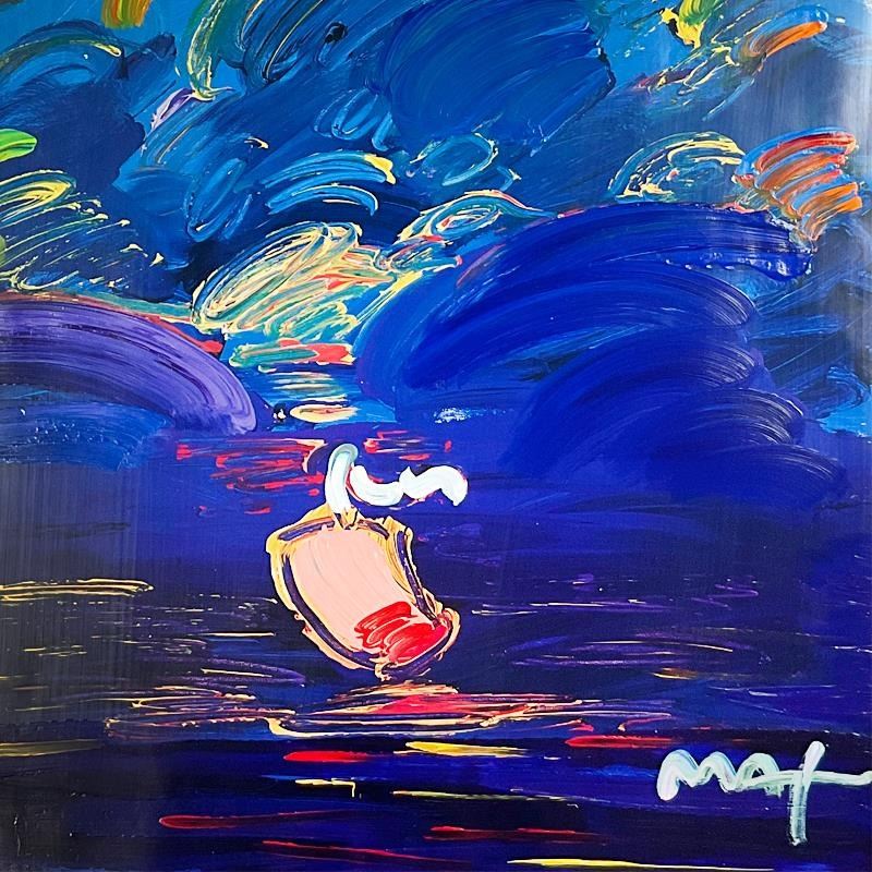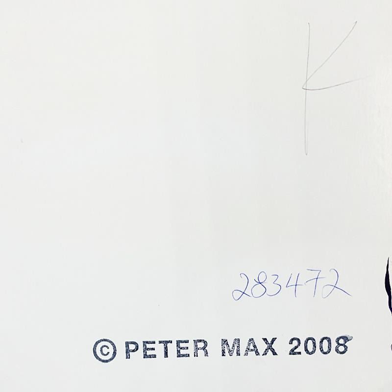 "Summer Storm" is a one-of-a-kind acrylic mixed media on paper, hand signed by Peter Max. The piece comes custom framed with a backside cutout to display Peter Max Studio registration number 283472 certifying authenticity. Measures approx. 48.5" x 36.5" (frame), 36" x 24" (image).