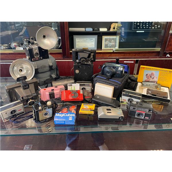 Collection of various eras of antique cameras from the 30s to the 90s.