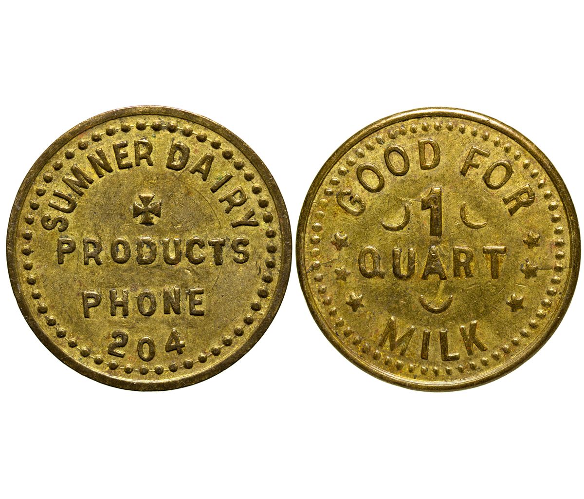 Obv.: Sumner / Dairy / Products / Phone / 204; rev.: Good For / 1 / Quart / Milk. Rd., Br., 21mm, R6. -60717