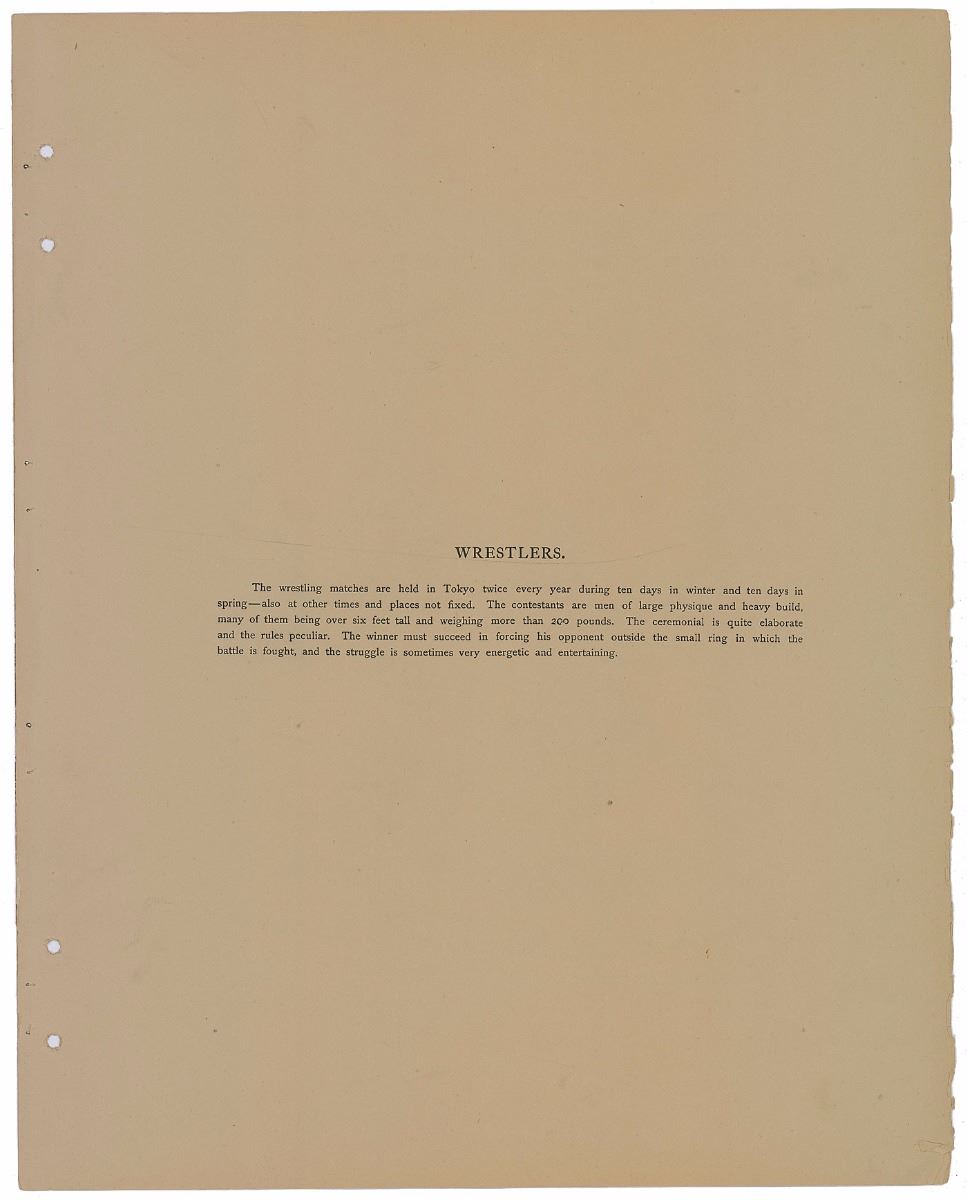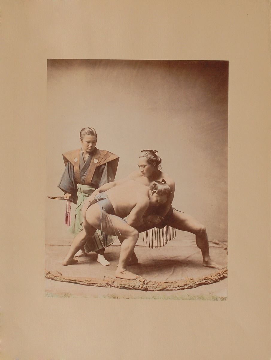 Circa 1880s hand-colored 7.75 x 10 albumen photo of two sumo wrestlers and a referee affixed to its original 12 x 15.5 portfolio page retaining its captioned coversheet. Attributed to Austrian photographer Baron Raimund von Stillfried, whose work was instrumental in introducing traditional Japanese culture to the Western world. In fine condition, with light chipping to edges and binding holes to the left edge.