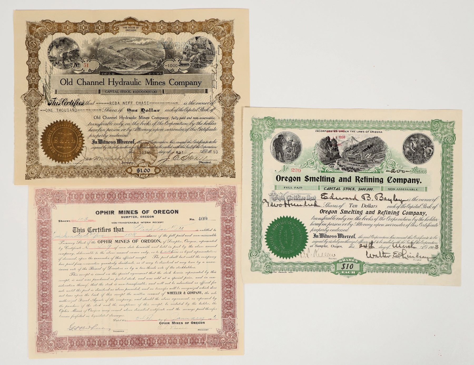 Lot of 3. I/U, 1910 Old Channel Hydraulic Mines Co. Mint & Co. printer. I/U, 1903 Oregon Smelting and Refining Co. Sumpter American Print printer. I/U, 1906 Ophir Mines of Oregon, Smith & Thomson printer. VG cond.