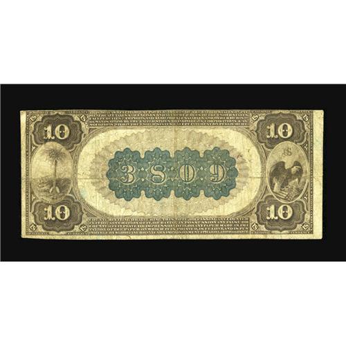 <B>Sumter, SC</B></I> - $10 1882 Brown Back Fr. 487 <B>The First NB</B></I> Ch. # (S)3809<BR>This is the second title under which this institution issued Brown Backs. While two federally chartered banks here issued the Brown Back type, this is the only one with documented survivors. Just three $10 Brown Backs have been verified from here and only 26 for the entire state. The ink signatures remain fully legible and there are just two pin holes. Experienced South Carolina collectors will be well aware that the wait for another note of this type and denomination from here will be of unpredictable length and should bid accordingly. <B>Fine.</B></I><BR><BR><b>Shipping:</b> Coin/Currency (<a target="_blank" href="http://www.heritageauctions.com/common/shipping.php">view shipping information</a>)
