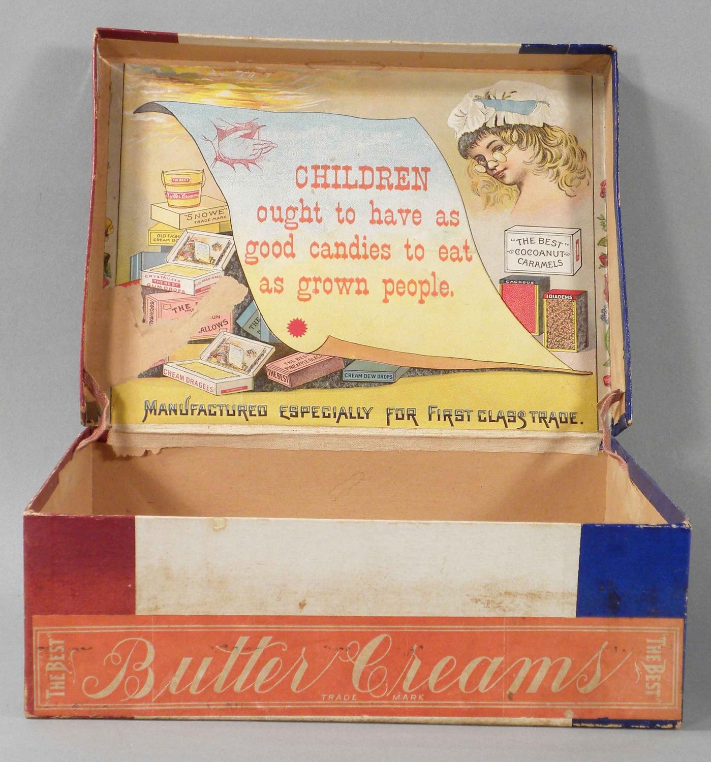 Sun Brand Butter Creams Store Display Box. Colorful graphics on interior label. Box left side lid torn and paper loss on label at 7:00 otherwise very good condition. 9 X 7 X 3 inches closed. Starting bid $30