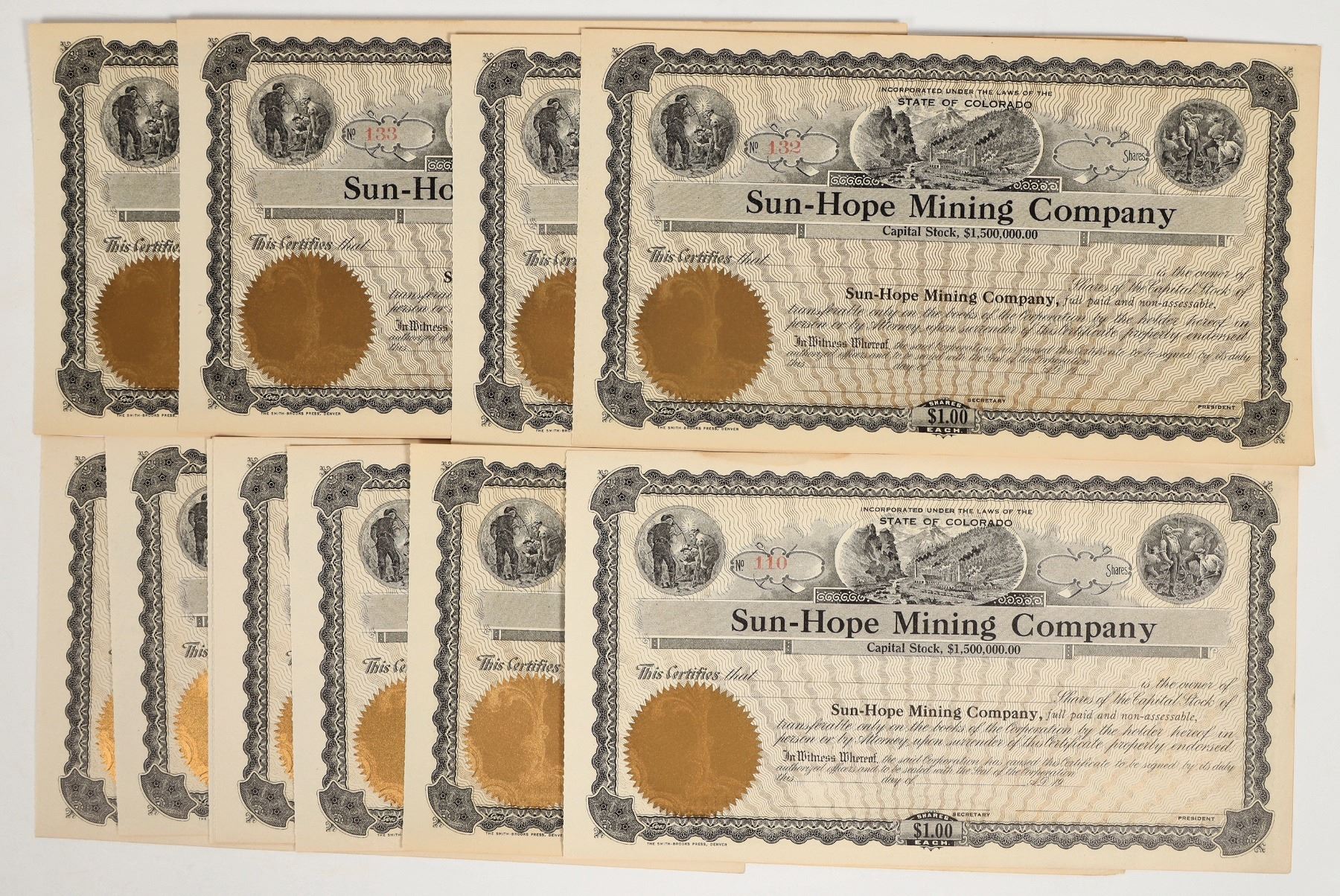 About 12 unissued stock certificates in Sun-Hope Mining Company. Three mining vignettes, gold seal, 10 x 6 inches. Works included Centennial Lode and Good Hope.