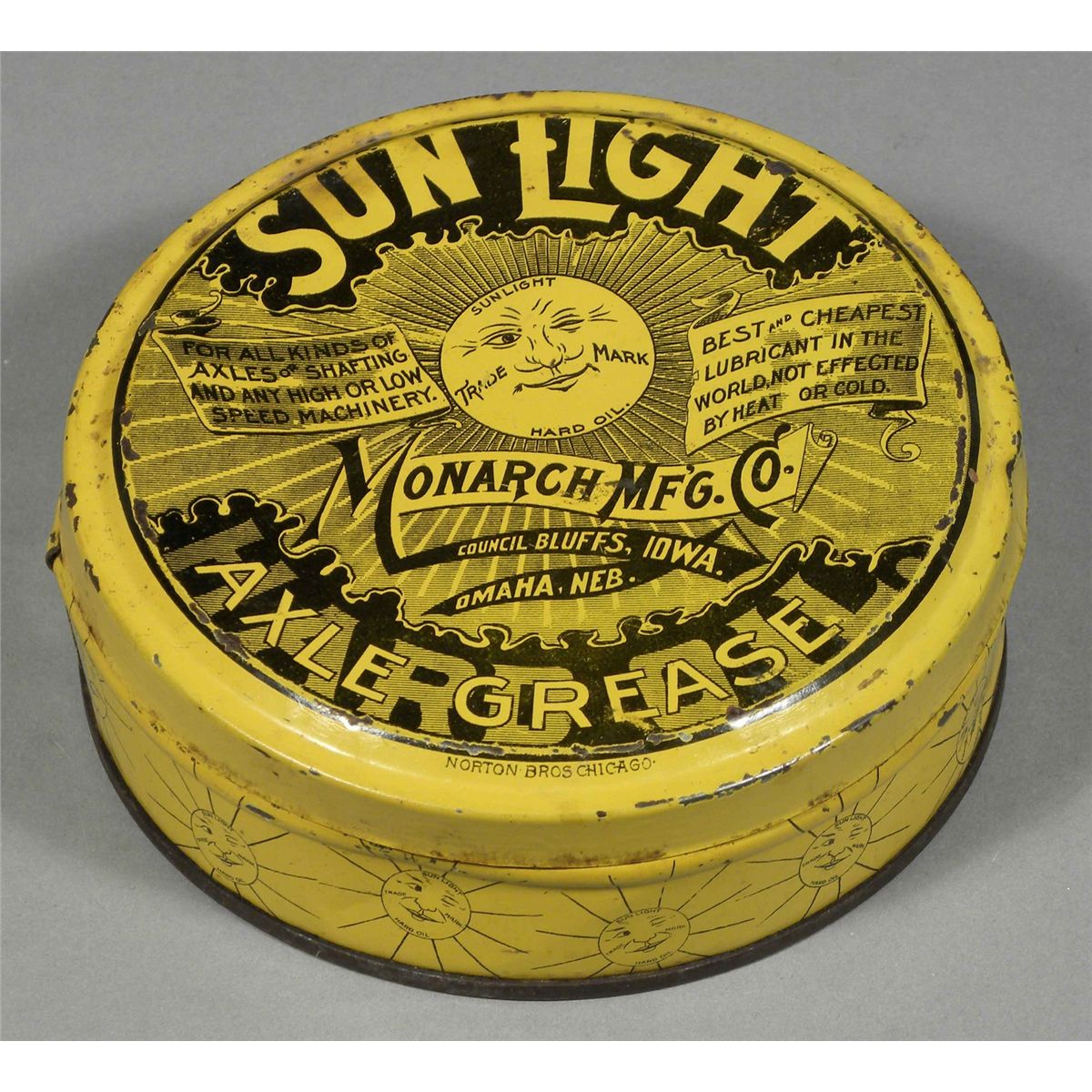 Sun Light Axle Grease Tin. Dents and discoloration on lid otherwise good condition. 5 1/4 inch diameter. Start Price $30