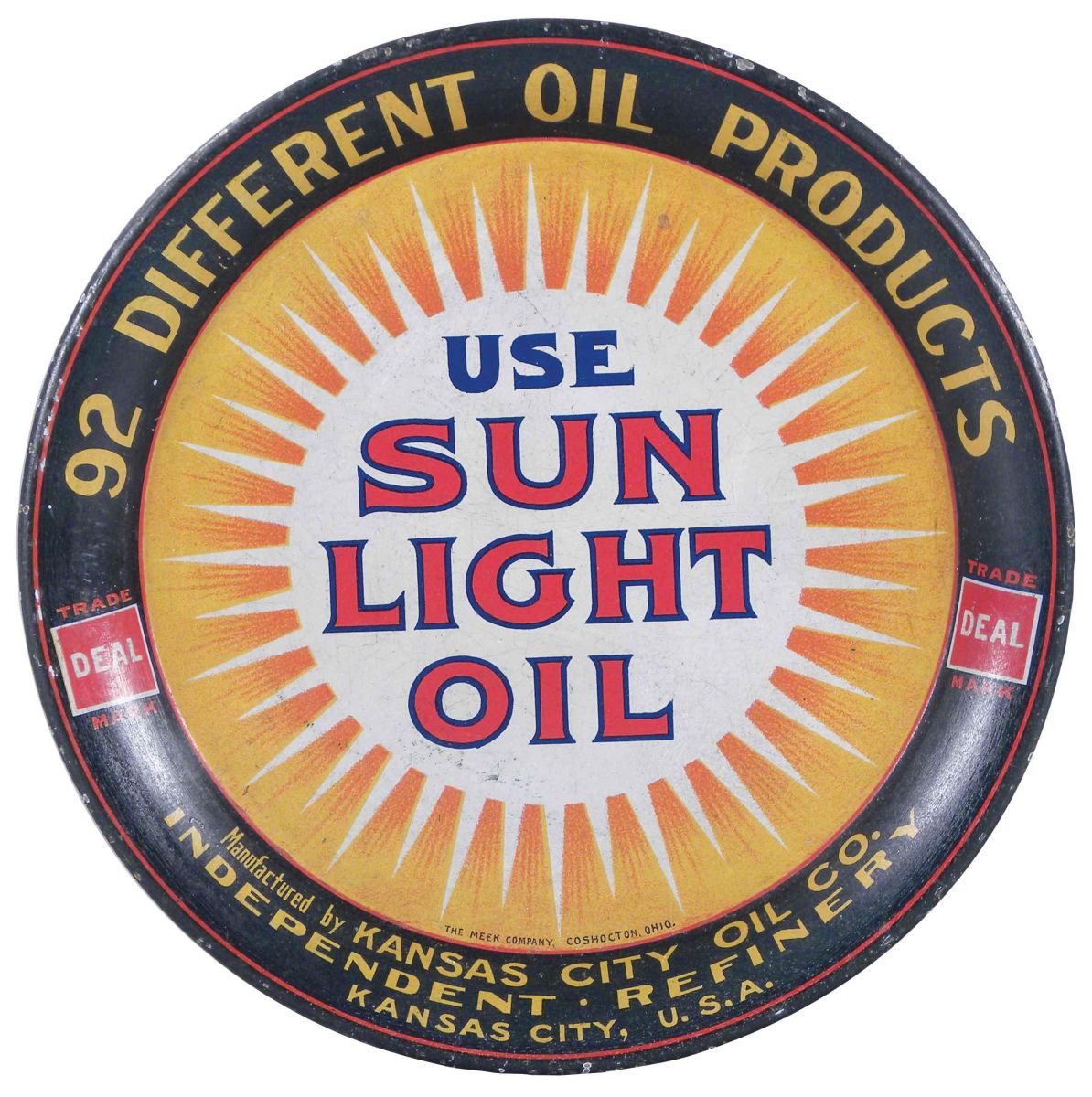 Sun Light Oil Tin Tip Tray. Mfg by Kansas City Oil Company. Minor perimeter chips otherwise excellent condition. 4 1/4 inch diameter. Start Price $20