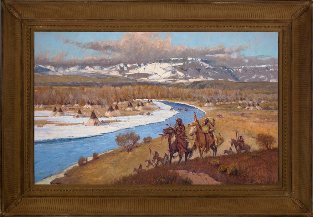 Artist: John DeMott. Title: Sun River Encampment. Size: 30" x 48". Medium: Oil. Description: The Sun River is known to the Blackfeet Indians as the Medicine River because of unusual mineral deposits along its banks which possessed powerful medicinal properties. The river cuts a handsome path through a narrow canyon, unlike any other in Montana, as it winds its way out of the Bob Marshall Wilderness. The river flows through the prairie grasslands, and finally meanders past cottonwood bottoms on its way to Missouri at Great Falls. Free for centuries to follow the buffalo, various Native American tribes traversed the Lands along the Sun River. The benchlands provided a thoroughfare between western hunting grounds and the Judith and Musselshell hunting grounds east of the Missouri River. During the seventeenth century, the Flathead-Salish-Kutenai tribes lived along the Sun River, but these groups lost control due to wars during the early 18th century with marauding Blackfeet, who defended it fiercely. Eventually, over 10,000 Blackfeet commanded a 32,000 square mile territory extending from the Milk River to the North down to the Sun. The Blackfeet name for the Sun River, “The Great Medicine Road to the Buffalo", reflects the importance it held in their culture.