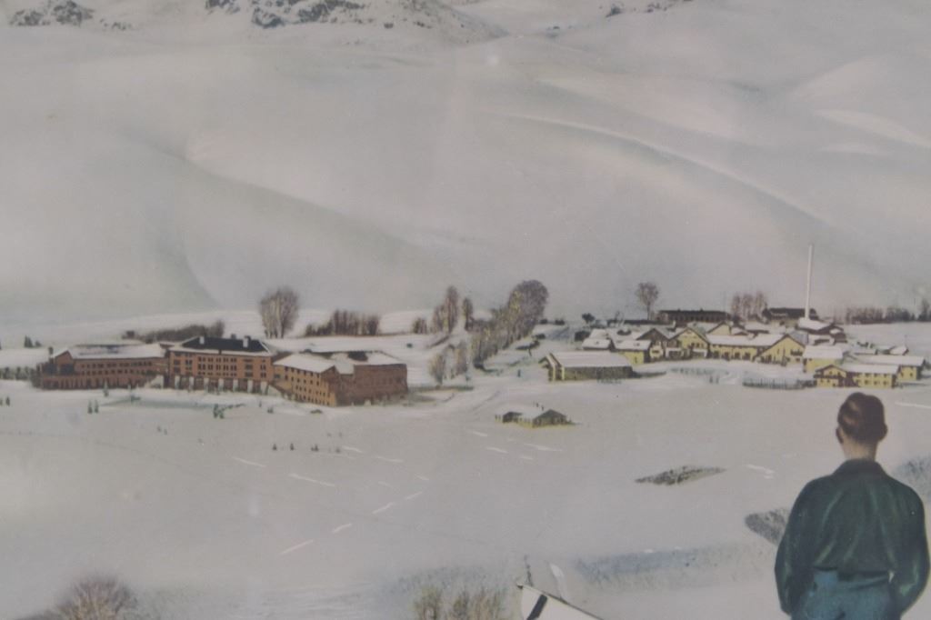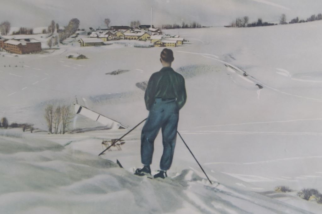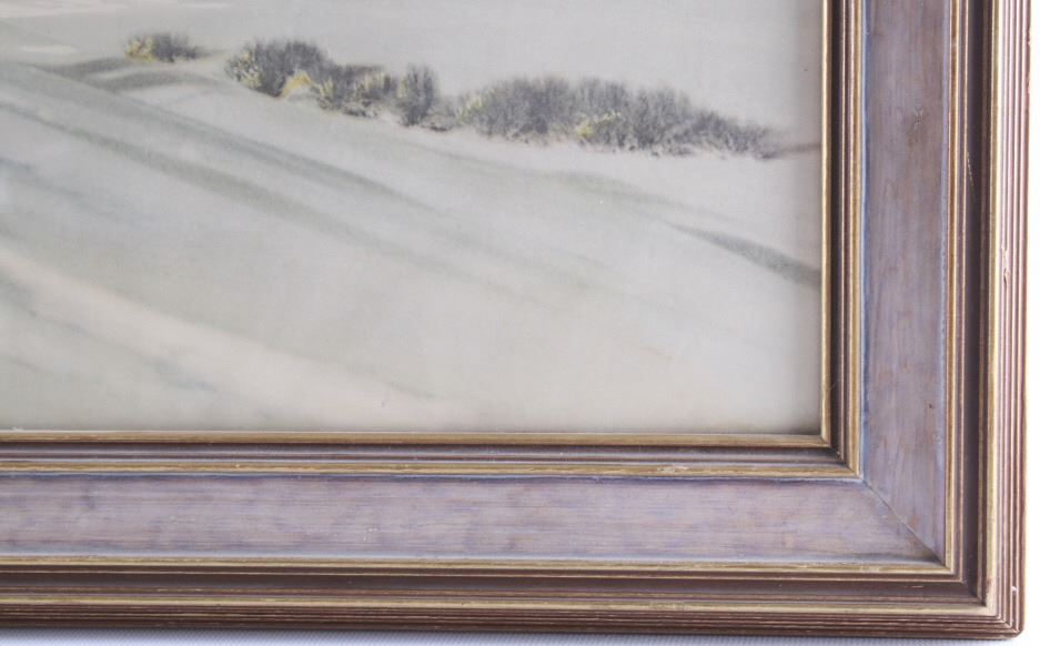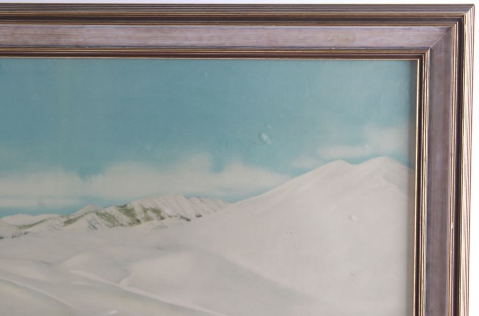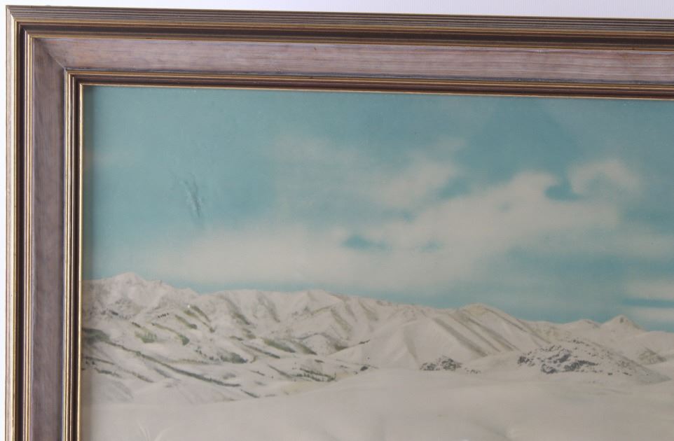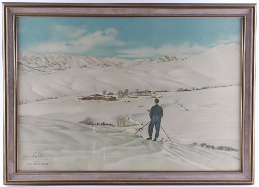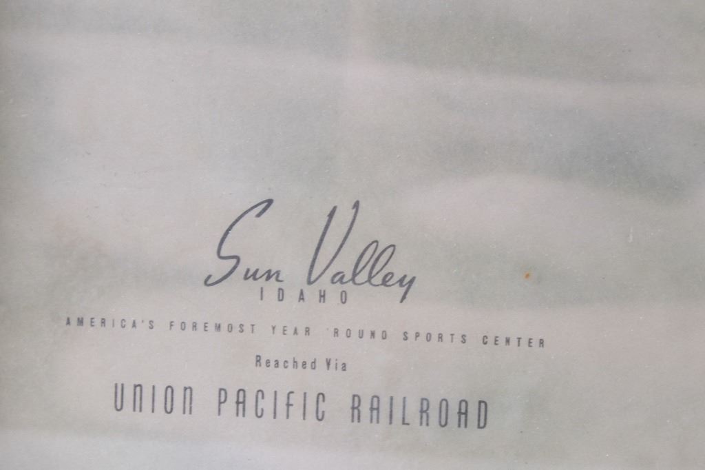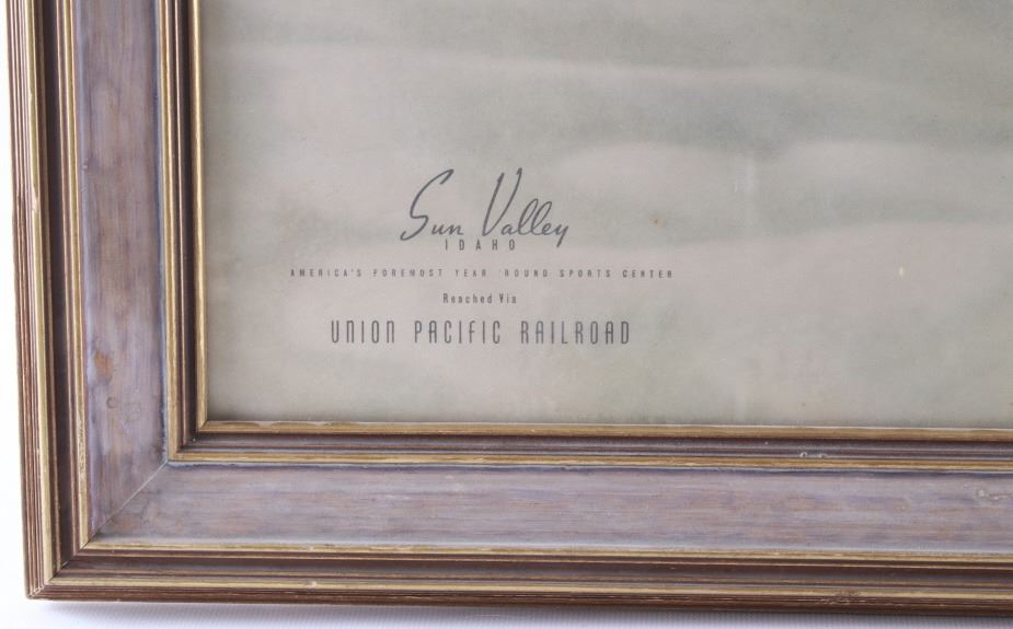 Featured in this lot is this Original Sun Valley, Idaho Union Pacific R.R. advertisement circa 1940's. The advertisement features a wonderfully and professionally crafted construction that shows a man in circa 1940's dress on skis looking over the lodge and the adjacent town with the snowy mountain range in the distance. The advertisement is marked in the bottom left hand corner as follows: Sun Valley Idaho - America's Foremost Year Round Sports Center - Reached Via - Union Pacific Railroad. The condition of this of this original advertisement is good with no obvious signs of damage to the advertisement and with little wear to the frame but otherwise in good overall condition. The measurements of this framed advertisement is 25 1/2" x 35 3/8" and the visible artwork measures 21 1/2" x 31 1/4".