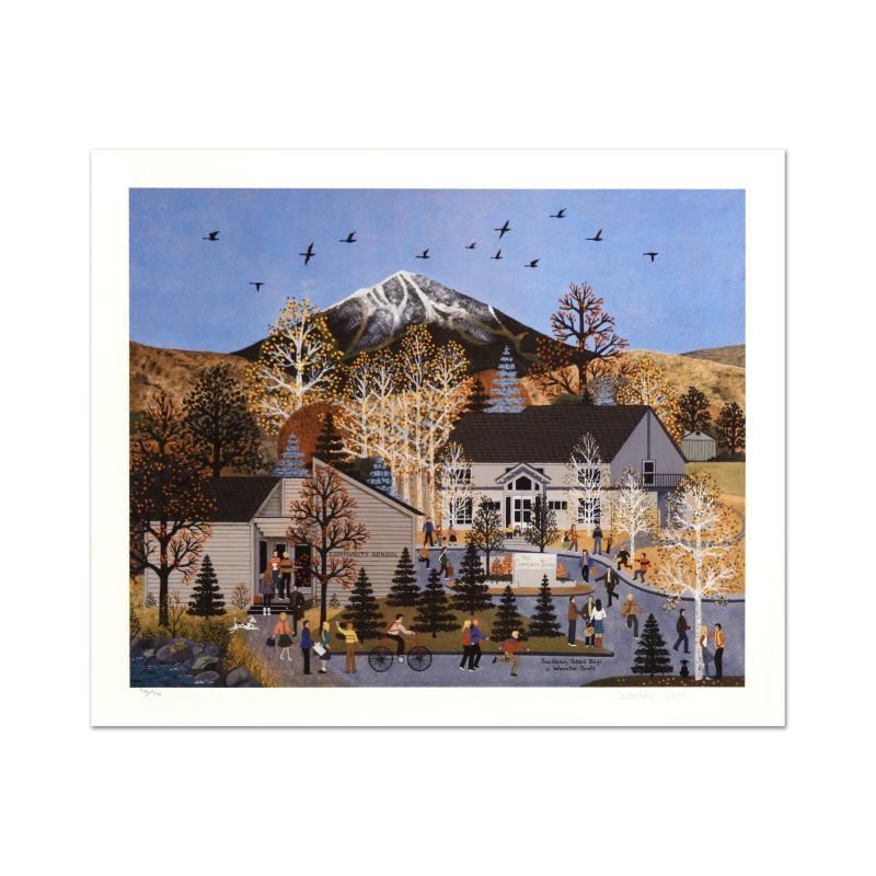 "Sun Valley School Days" is a limited edition lithograph on paper by Jane Wooster Scott, numbered, hand signed by the artist! Measures approx. 27" x 24" (with border), 27" x 22.5" (image).