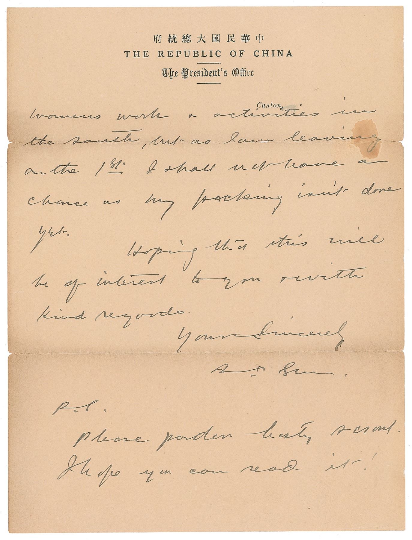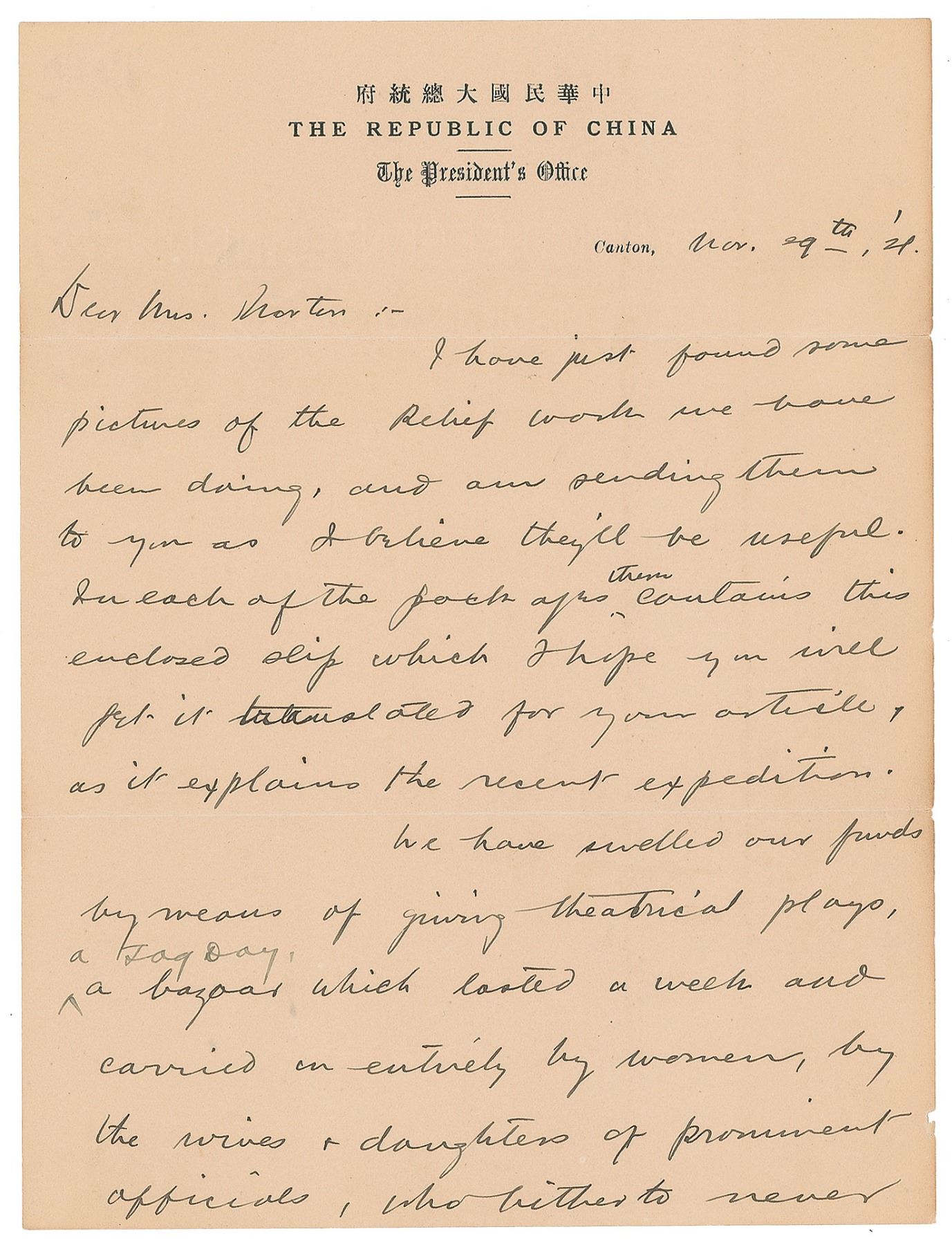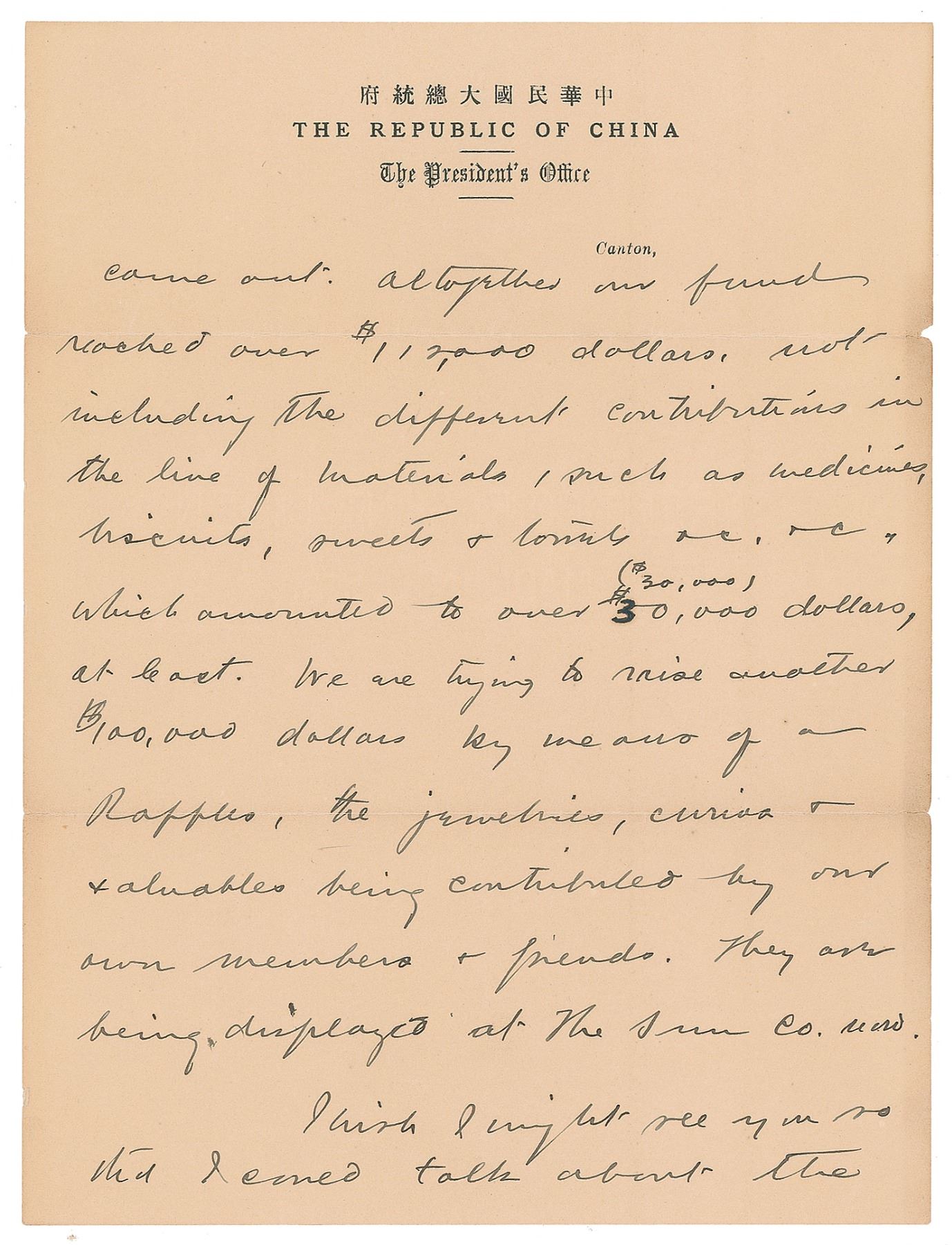ALS in English, signed “Y-S Sen,” three pages, 8 x 10.5, The Republic of China, President's Office letterhead, November 29, 1921. Letter to the journalist Mrs. Morton, regarding acts of humanitarian relief, photos of which he has just encountered and is sending her, along with a document explaining his recent failed Northern Expedition. He also discusses their success in raising money for humanitarian aid and for the Kuomintang party by organizing various events, such as theatre performances and a bazaar. He finishes by expressing his regret not being able to meet with her and discuss women’s actions in southern China due to his departure two days later. In full: "I have just found some pictures of the Relief work we have been doing, and am sending them to you as I believe they’ll be useful. In each of the packages there contains this enclosed slip which I hope you will get it translated for your article, as it explains the recent expedition. We have swelled our funds by means of giving theatrical plays, a Tag Day, a bazaar which lasted a week and carried on entirely by women, by the wives & daughters of prominent officials, who hitherto never come out. Altogether our fund reached over $112,000 dollars, not including the different contributions in the line of materials, such as medicines, biscuits, sweets and donuts &c, &c, which amounted to over $30,000 dollars, at least. We are trying to raise another $100,000 dollars by means of Raffles, the jewelries, curios & valuables being contributed by our own members & friends. They are being displayed at the Sun Co. now. I wish I might see you so that I could talk about the women's work & activities in the south, but as I am leaving on the 1st I shall not have a chance as my packing isn’t done yet. Hoping that this will be of interest to you & with kind regards…P.S. Please pardon hasty scrawl. I hope you can read it!" In fine condition, with a small stain to the last page, and some short splits to the fold ends.