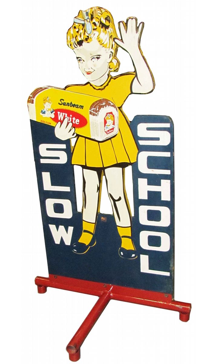 Sunbeam Bread Advertising Slow School Die Cut Wood Sign. Holsum Baking Co. Very good original condition. 30 X 48 inches.