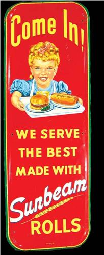 Sunbeam Bread Tin Beveled Embossed Sign. Edge ware, scratches and paint loss otherwise good condition. 19 X 55 inches.