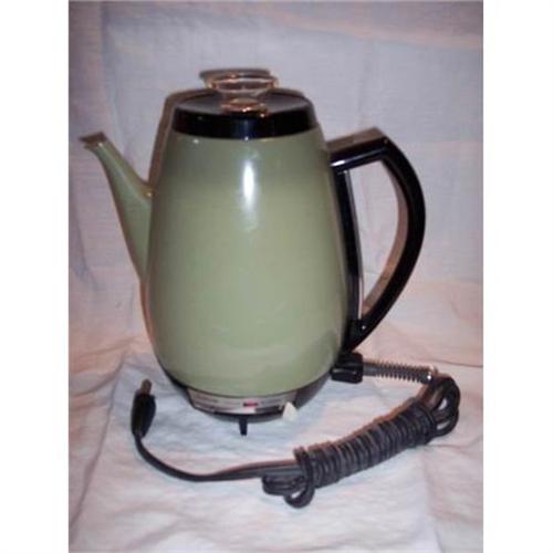 Perfect for a 70's kitchen decor, avacado green Sunbeam electric percolator, marked made in Chicago USA and is in excellent condition. Comes complete and works like a charm. Red indicator light works too.