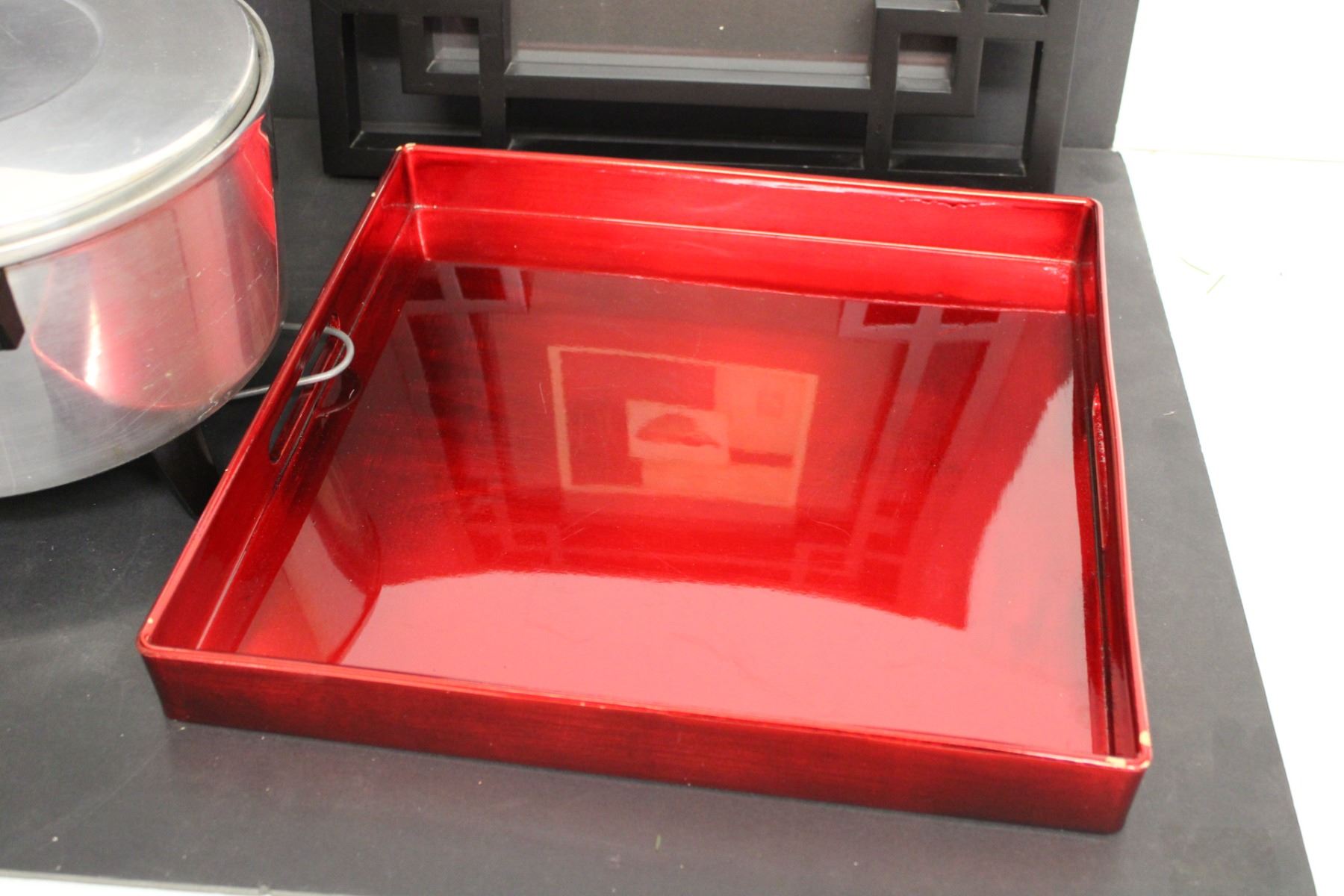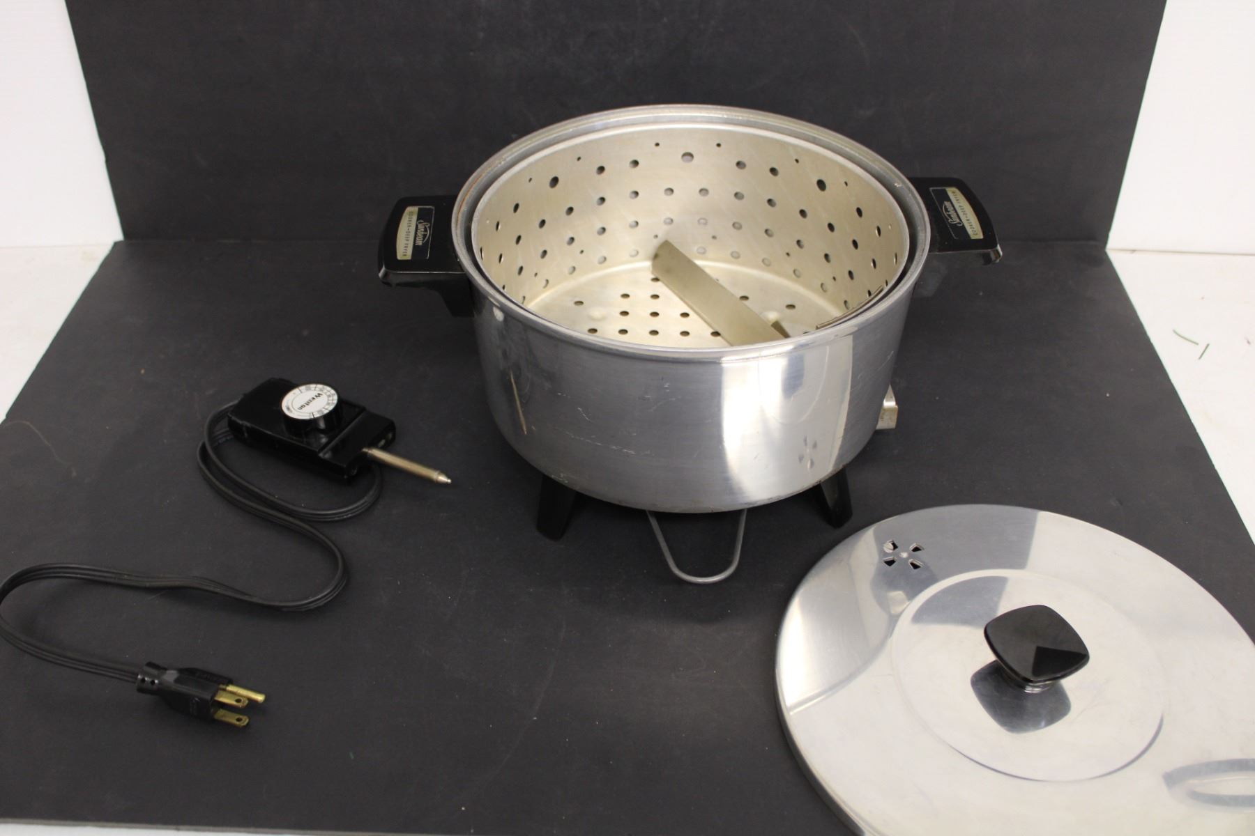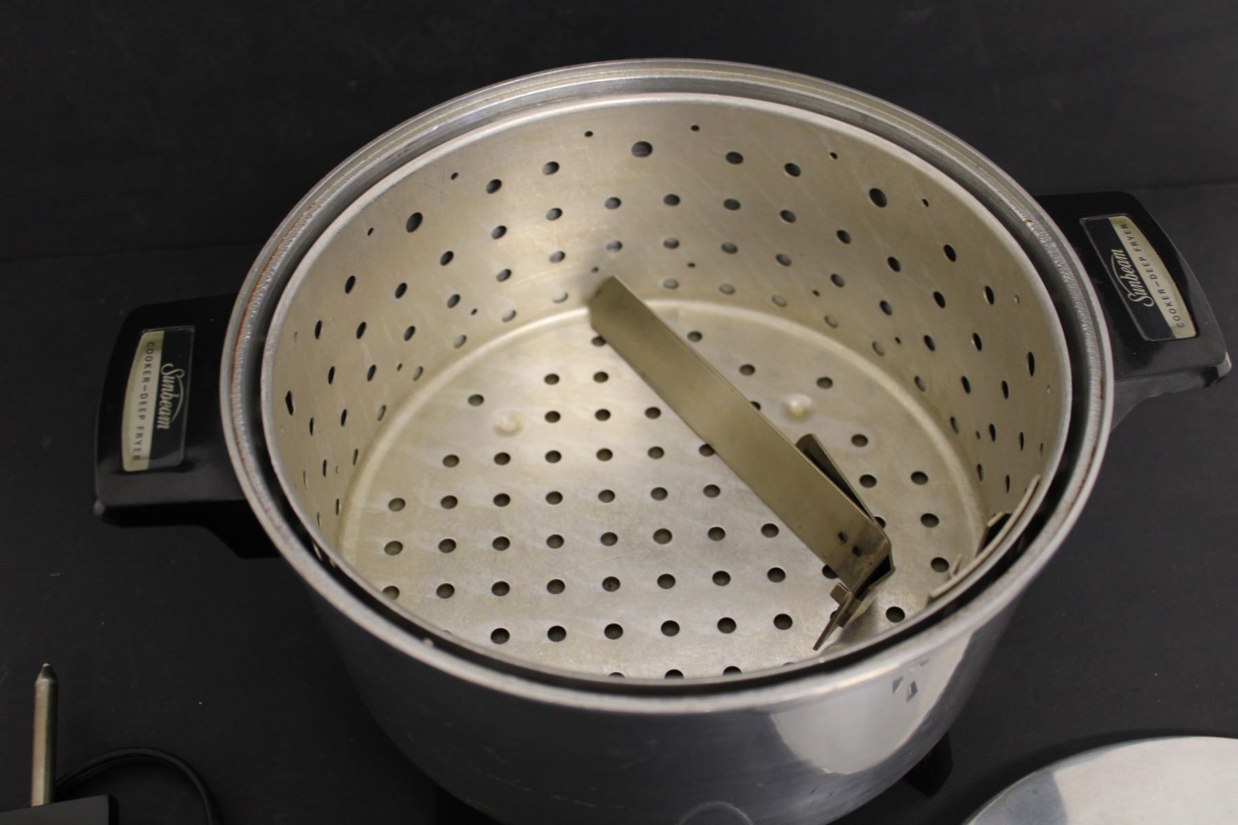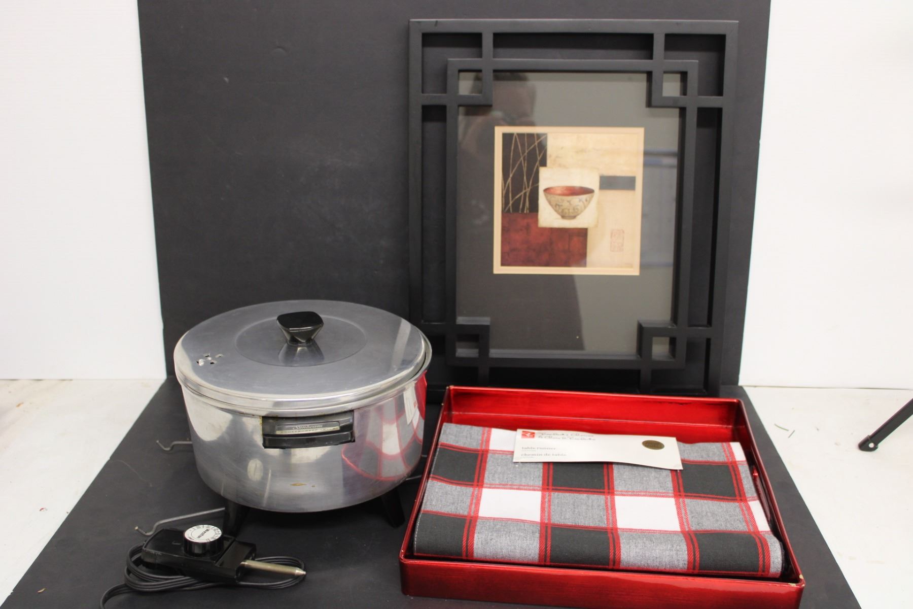 Sunbeam Deep Fryer- (powers on)- Table Runner- (NIB)- Plastic tray, (14''x 14''), Picture of bowl (1