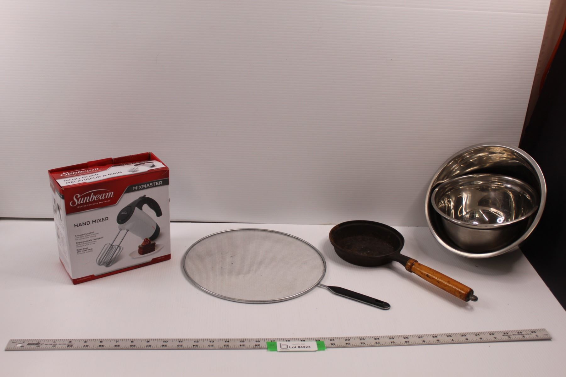 Sunbeam MixMaster (Appears NIB), Pan Screen, (2) Stainless Steel Mixing Bowls & 6" Cast Iron Skillet w/Wood Handle (Made in Taiwan