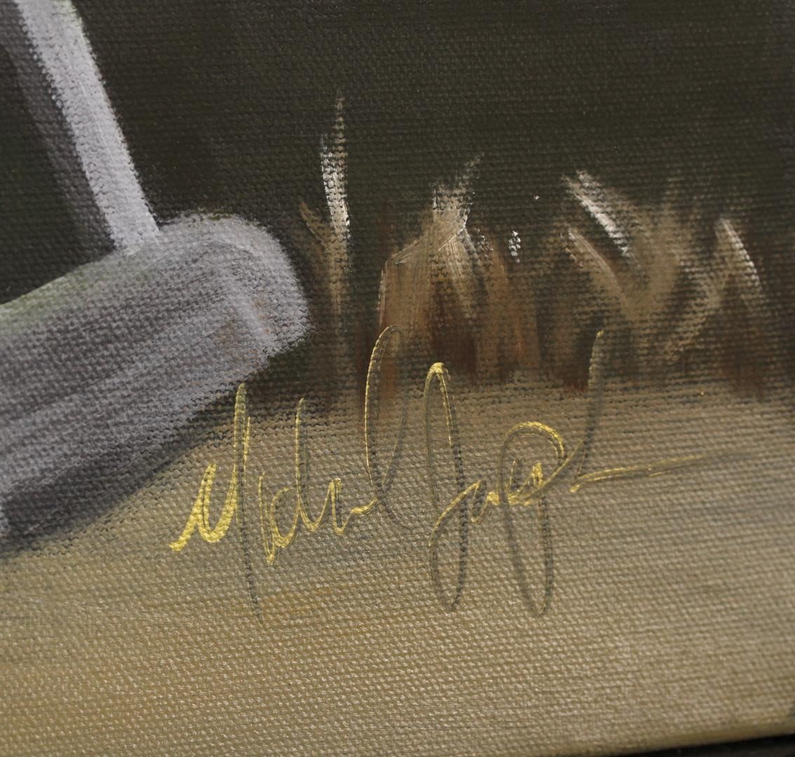 Framed Original Oil on Canvas Michael Joseph captured Tiger Woods in his prime, lining up his put with that signature assist from his tongue. This original oil portrait was displayed in Westlake Village, during the Tiger Woods sponsored PGA Invitational at Lake Sherwood Country Club in 2008. The painting has a minimalist floater frame in black and brushed gold. The oil is signed by the artist, who died in 2009. This painting measures 48x36" before framing. Ship weight approx. 30 lbs.