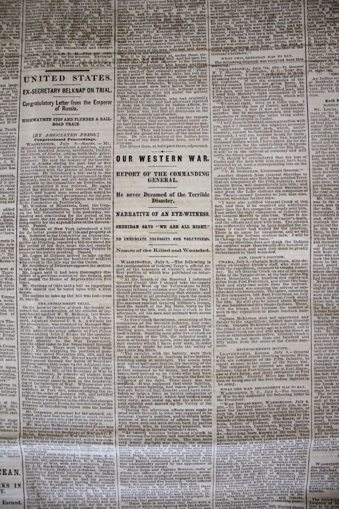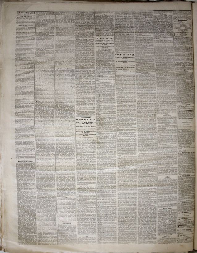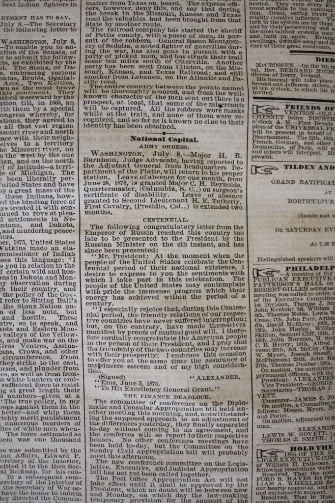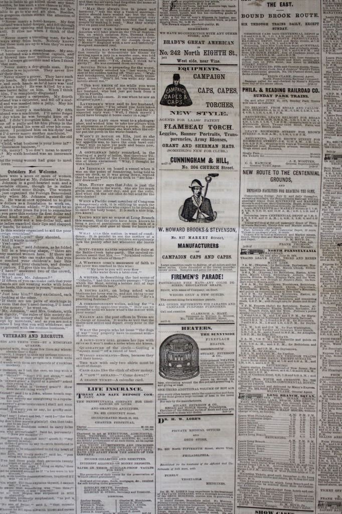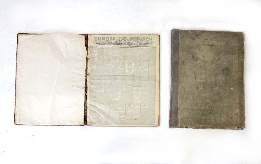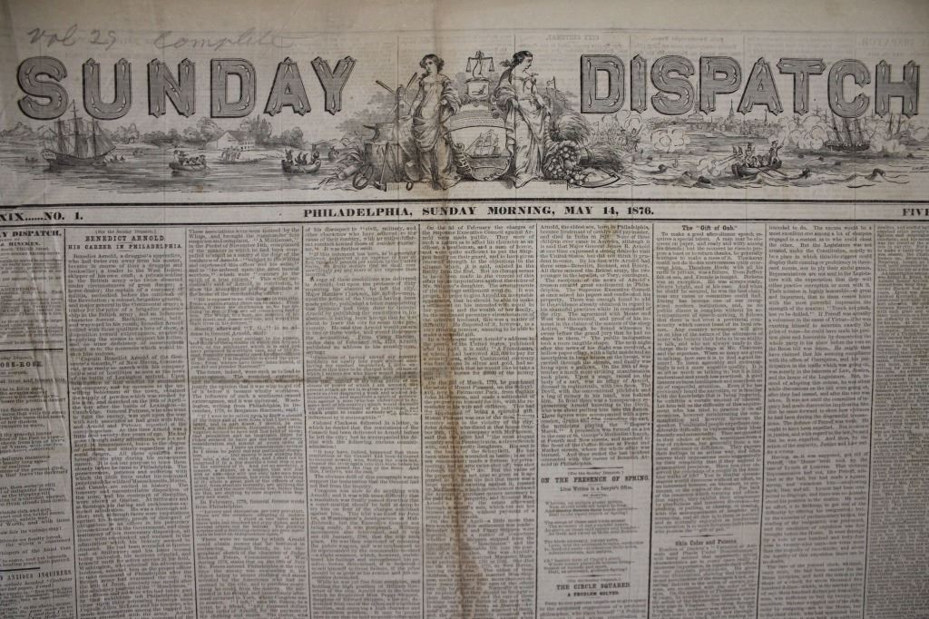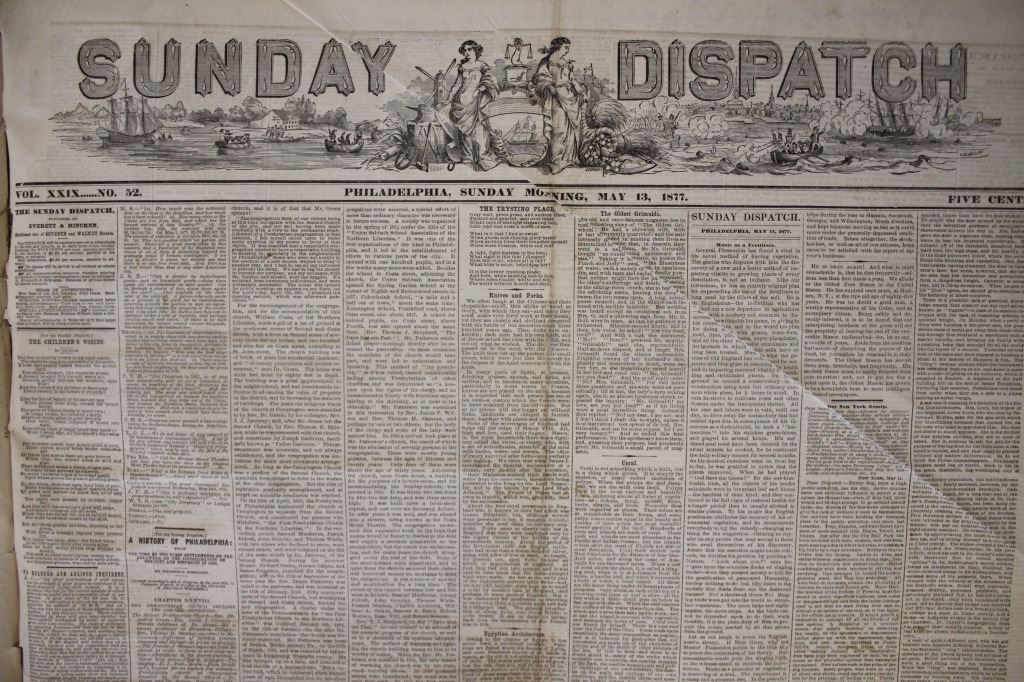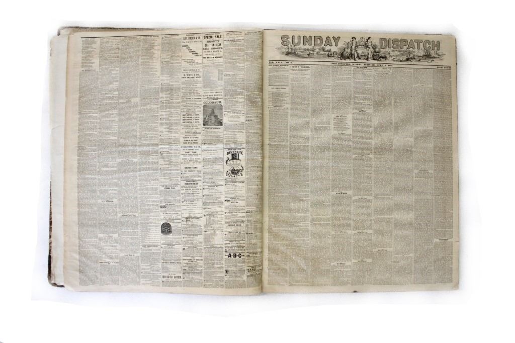 For your consideration are two newspaper record collections of the Philadelphia Sunday Dispatch 1876-1877. July 9th, 1876 includes an article about "Our Western War" discussing General Custer and General Terry's official report. These rare, preserved Sunday newspapers are covered in a folio and show sign of age throughout yet still hold many readable records and articles from the late 1800's. Philadelphia was a major city in the U.S and The Centennial International Exhibition of 1876, the first official World's Fair to be held in the United States, was held in Philadelphia, Pennsylvania, from May 10 to November 10, 1876, to celebrate the 100th anniversary of the signing of the Declaration of Independence in Philadelphia. These newspapers show the Sunday page from May 14, 1876 to May 13, 1877. These measure approximately 24" x 32" folded.