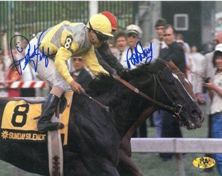Sunday Silence completed an inauspicious 2-year-old season with one victory in three starts. Sunday Silence matured dramatically between two and three years old and began his 3-year-old season and suddenly put himself front and center for the Triple Crown. Sunday Silence prevailed against Easy Goer by a nose after a thrilling Preakness stretch duel, most observers credited Pat Valenzuela with outriding Pat Day, who later admitted he would have done things differently. Easy Goer then denied Sunday Silence's bid for the Triple Crown with an eight-length romp at his home course in the Belmont Stakes. This 16x20 Photo from that photo finish at the Preakness at Pimlico is signed by both jockeys Pay Valenzuela and Pat Day. Private Signing 7/31/2013 & 8/1/2013 in Rosemont, IL. MAB Hologram and Certificate of Authenticity from Athlon Sports.