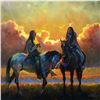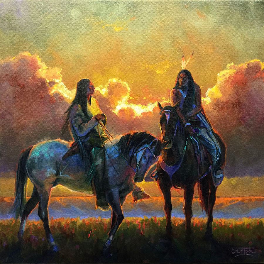 Artist: Colt Idol. Title: Sundown Social. Size: 16"x16". Medium: Oil. Description: The full, backlit clouds in this painting provide a pleasing, composition enhancing backdrop for the pair of riders on the hilltop. What a nice setting to pause for conversation.