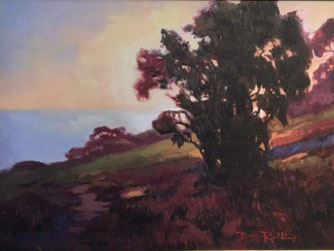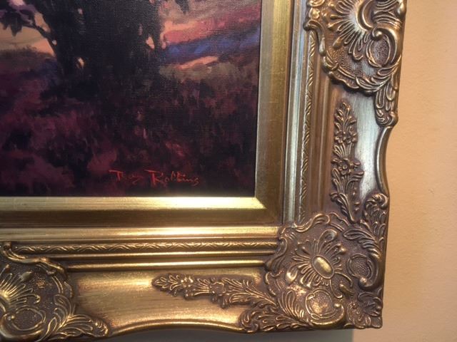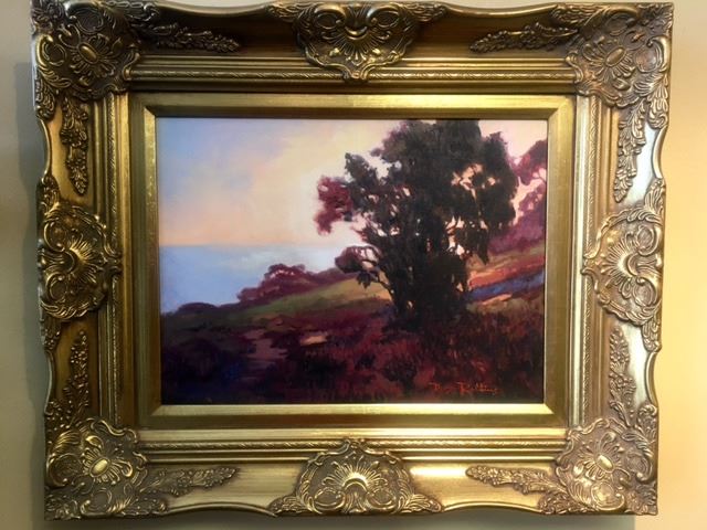 This subtle but dynamic sunset could be anywhere, but most likely it's from California artist Ray Robbins adopted home south of Los Angeles. Famous for his landscapes and animal paintings, Robbins show off his skill at capturing a mood and a moment with a minimalist approach . This Original oil by Ray Robbins is Framed in a golden tone decorative baroque style. It measures 12x16" Unframed, but 19.5x 23.5" framed dimensions.