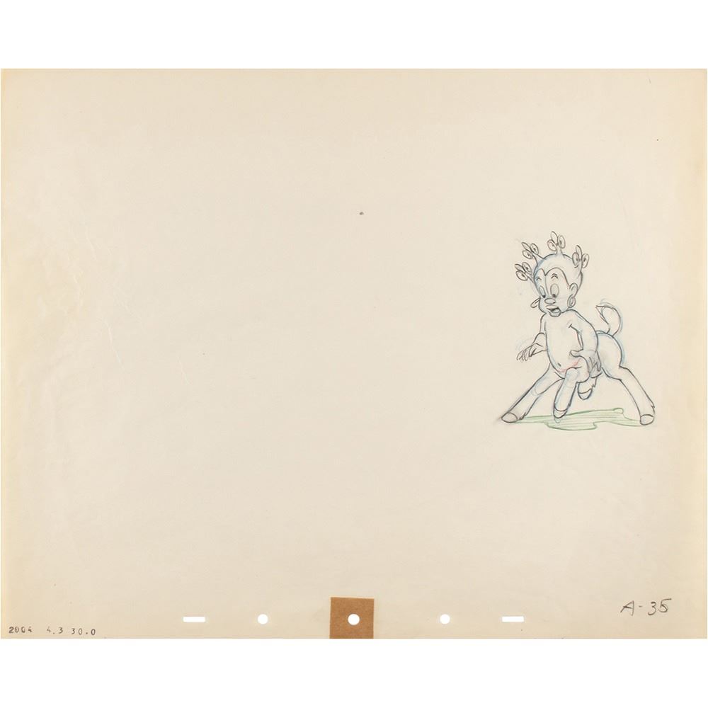 (Walt Disney Studios, 1940) Rare original production drawing featuring Sunflower, the young black centaurette from the 'Pastoral Symphony' segment of Fantasia. Accomplished in graphite and colored pencil on untrimmed 15.5 x 12.5 animation paper, which is marked "A-35" and stamped "2004, 4.3, 30.0." Image measures 3.5 x 4.25. In fine condition, with mild wrinkling to the left side. Sunflower appeared in Fantasia during its original theatrical run, but has been removed from all releases since 1969 due to perpetuating racial stereotypes.